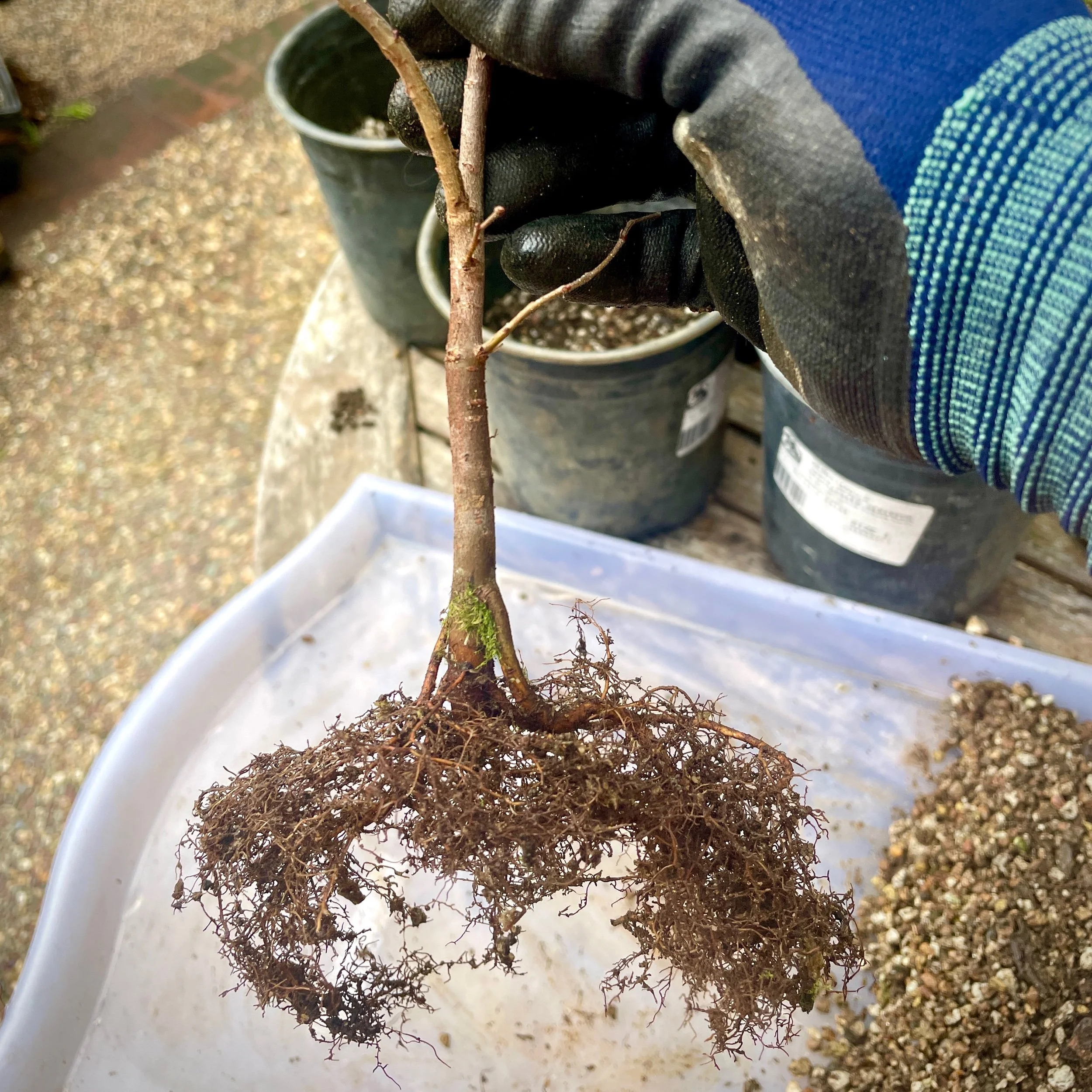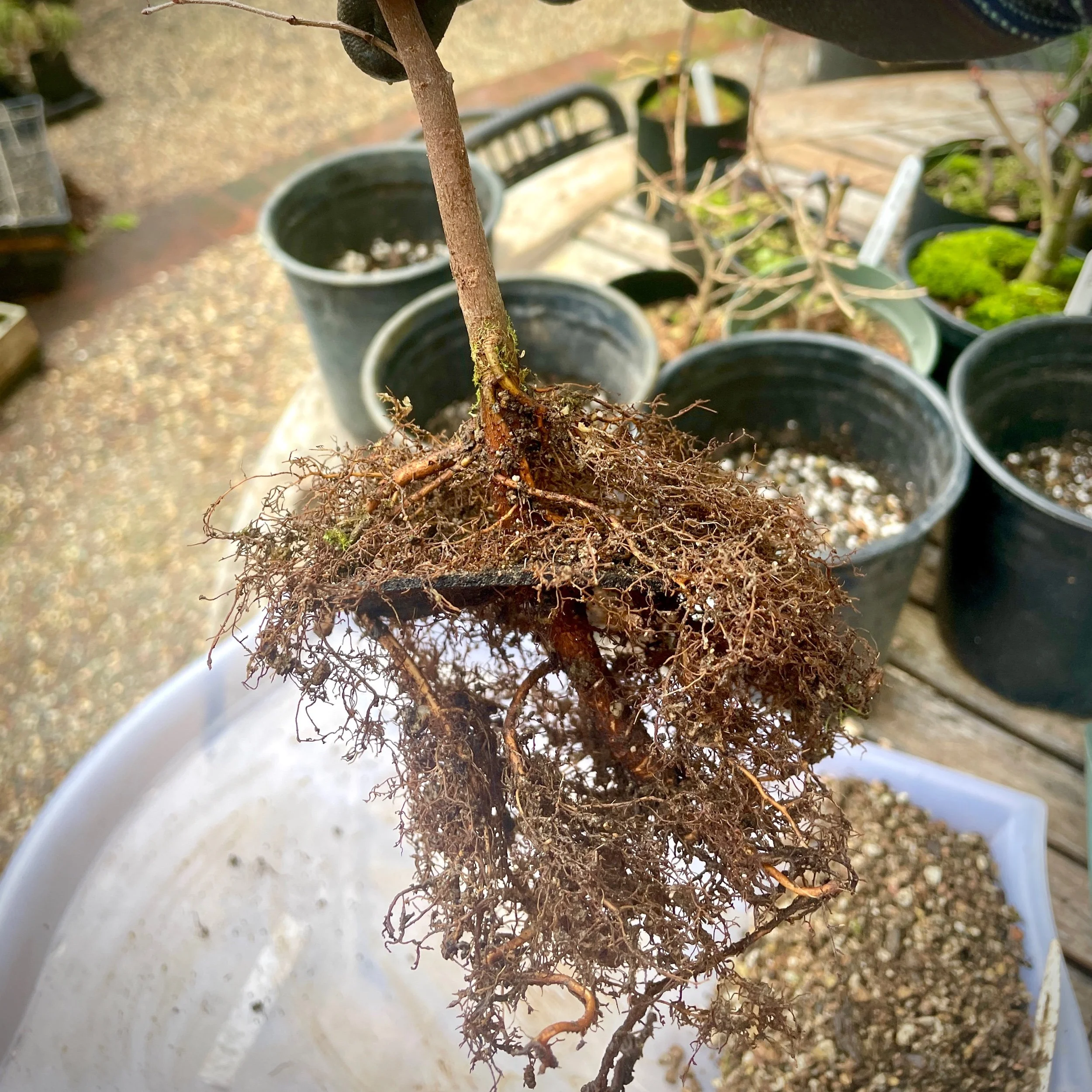 Advancing last year’s Japanese Maple air-layering. Evaluating root growth, selecting flat and radiating roots, removing any host trunk below the soil-line.