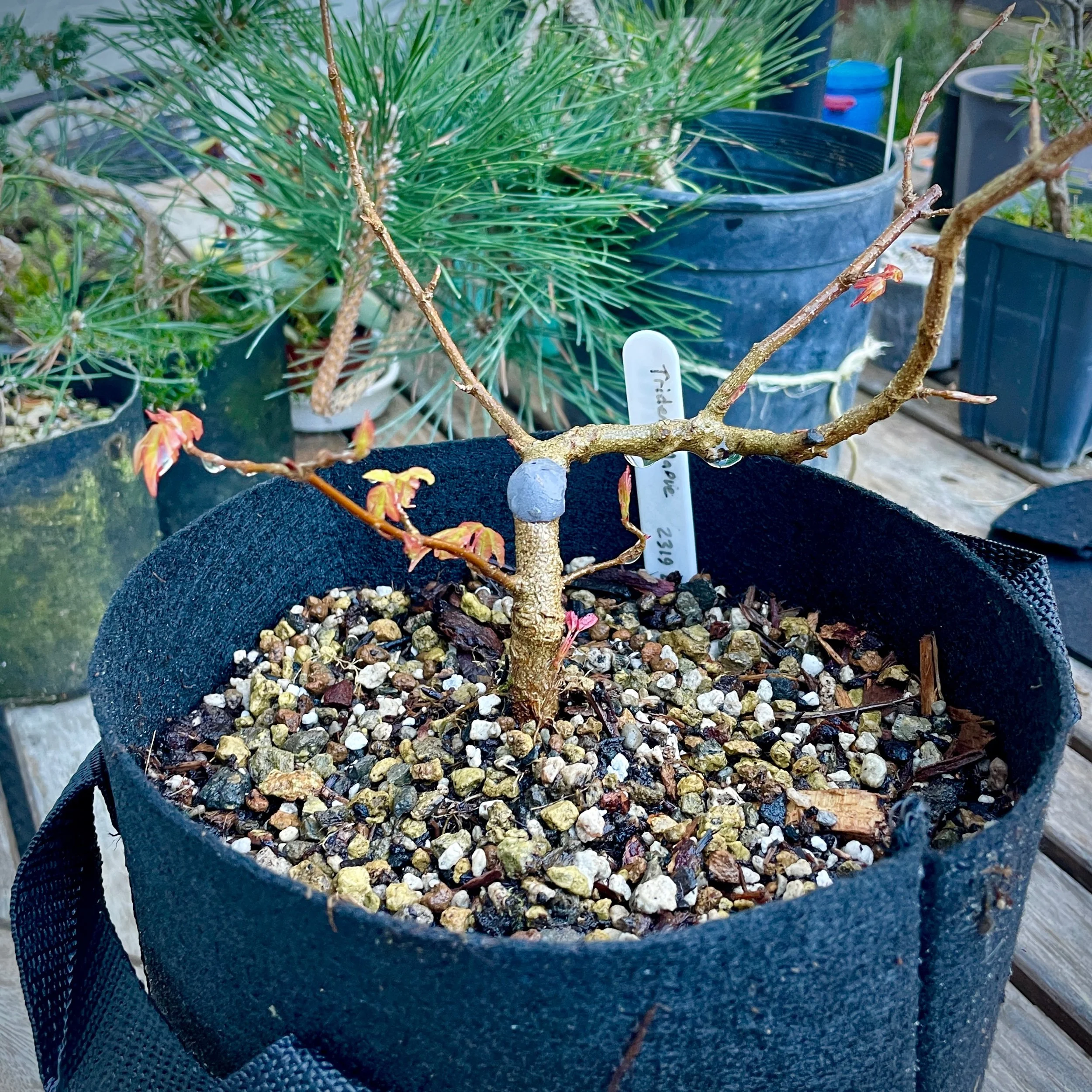 Last year yielded a number of air-layered maples, multiple Trident and Larch seedlings are ready for year two. A handful of Cork Bark Elms and two Red Pines from seeds have a promising first year.