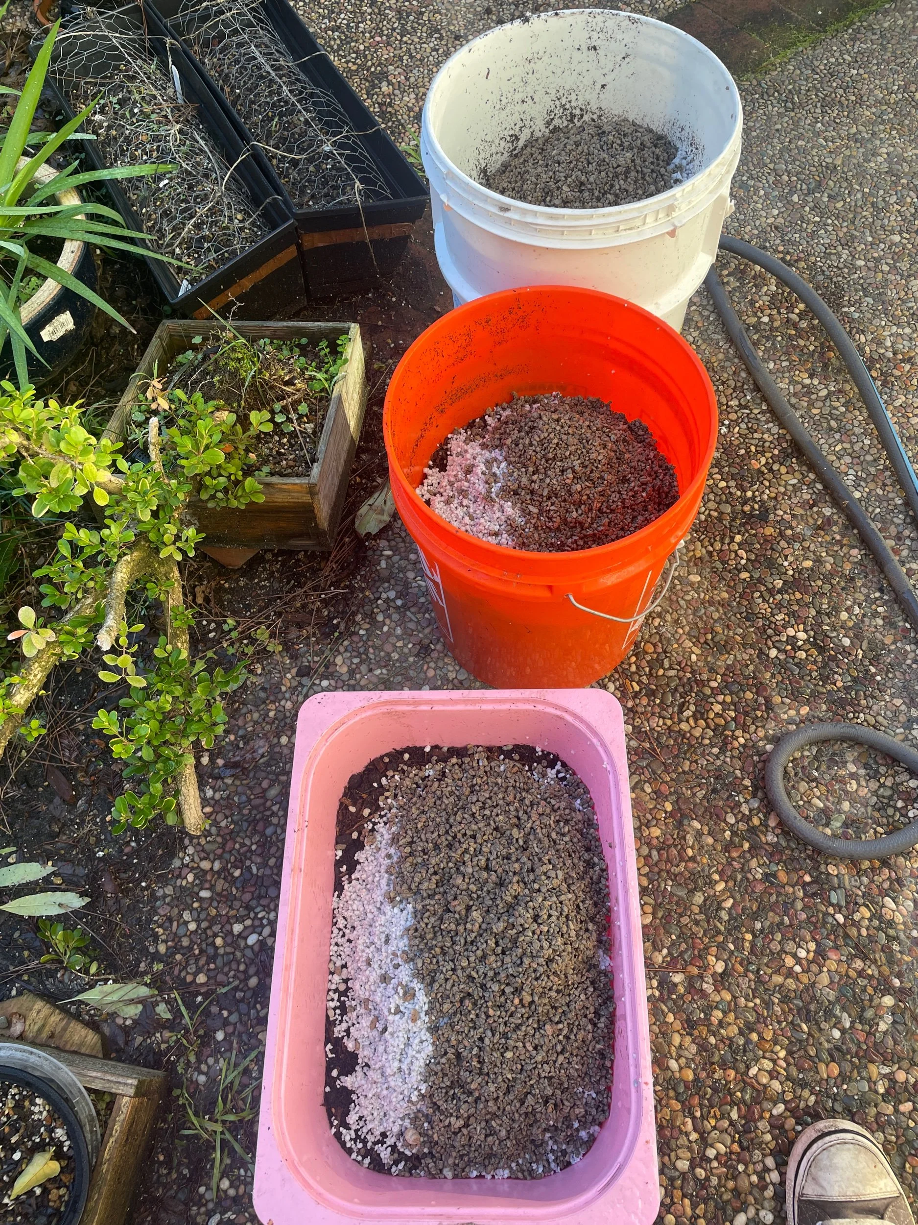 Stocked and sifted Perlite, akadama, and lava and scoria; armed with pots, baskets and grow boxes. Following Peter Tea’s advice, I am repotting plants in development early (Dec-Jan) to stimulate growth. I am also experimenting with soil medium & pots to stimulate trunk growth.