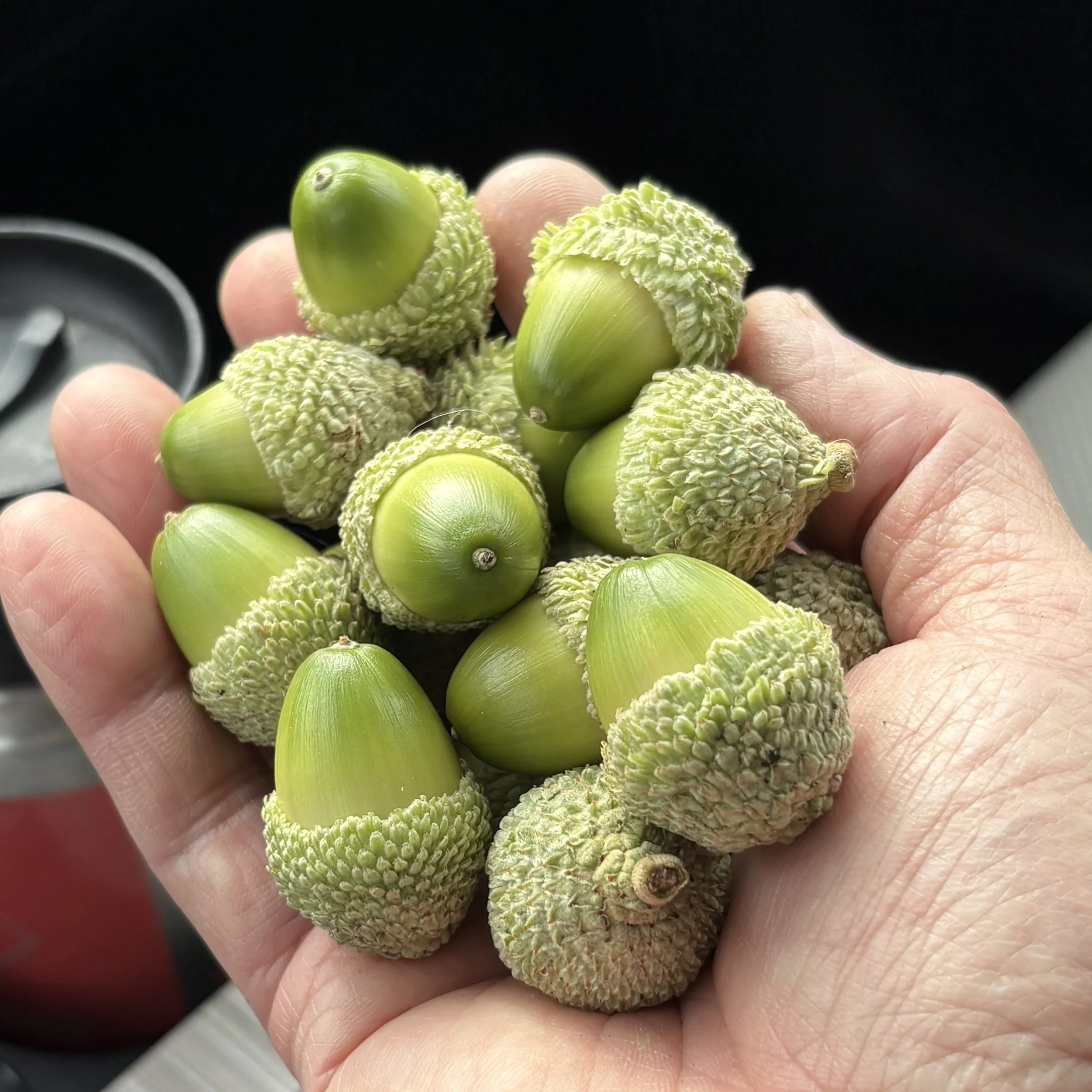 Visited a public cork oak tree in mid-Sep with only the start of acorns. Returned Oct 10 to find these, will return in a week for more. Squirrels are eating many, so they Mar grow and go fast.