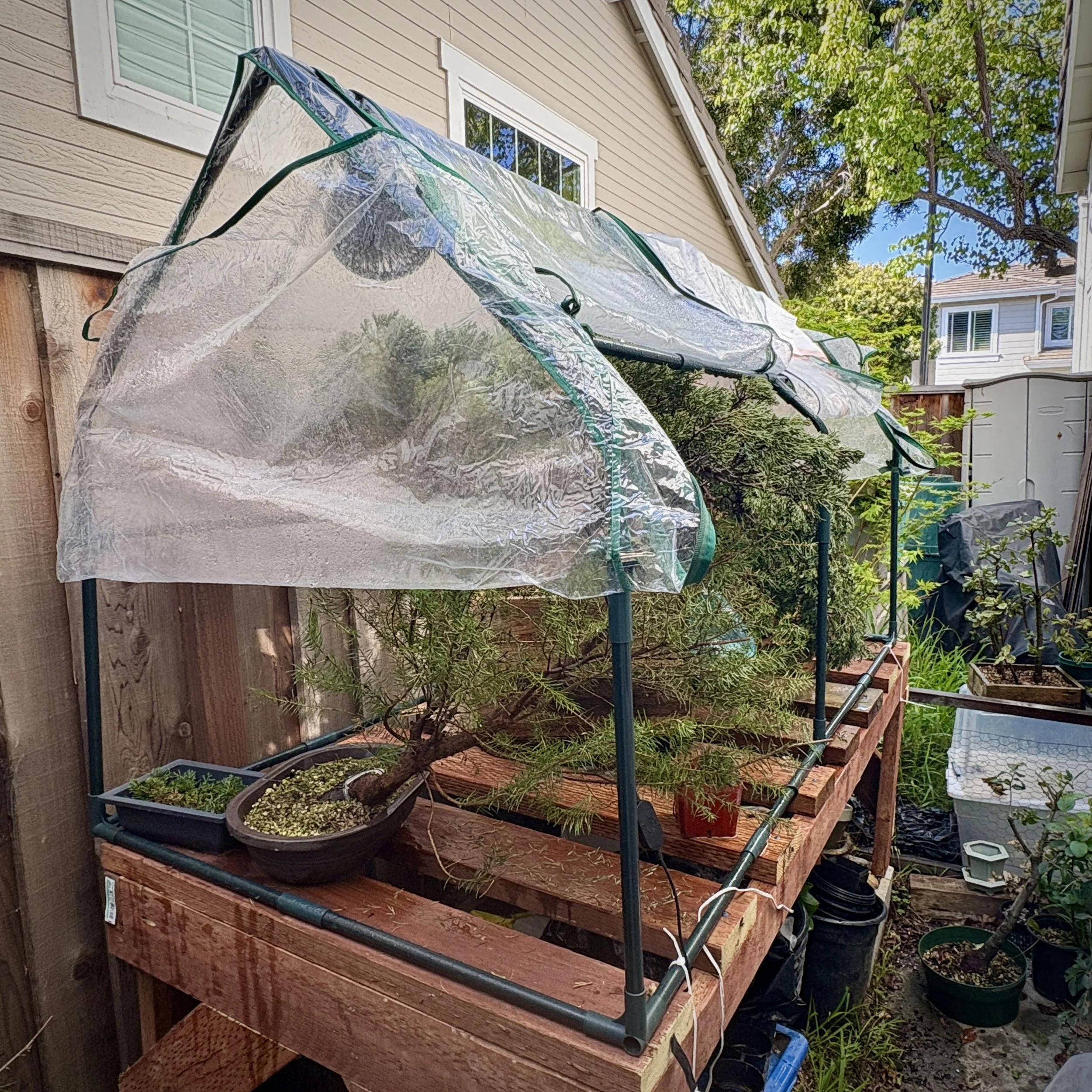 My intent is to build a low platform for two large Sierra Juniper’s each with a footprint of about 3‘ x 3‘, with nominal light and covered in a portable greenhouse. I will run electricity and moisture or climate control. These trees will be in the back of the garden And left to recover or at least two years to build roots.