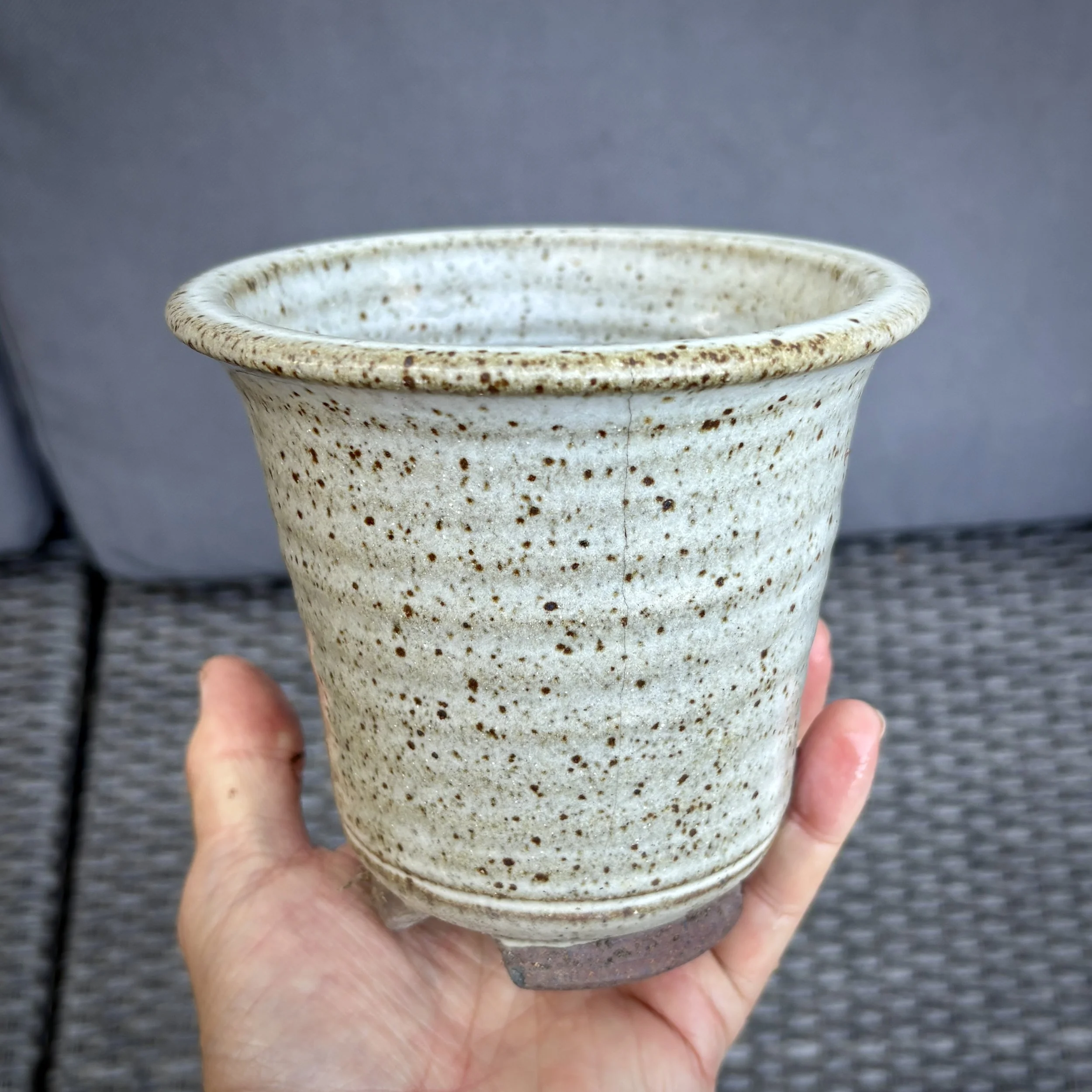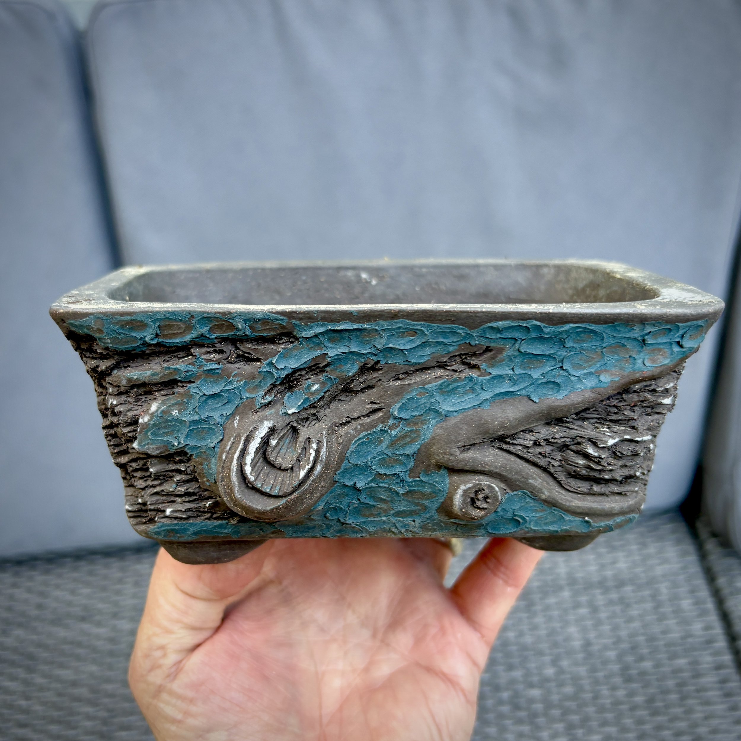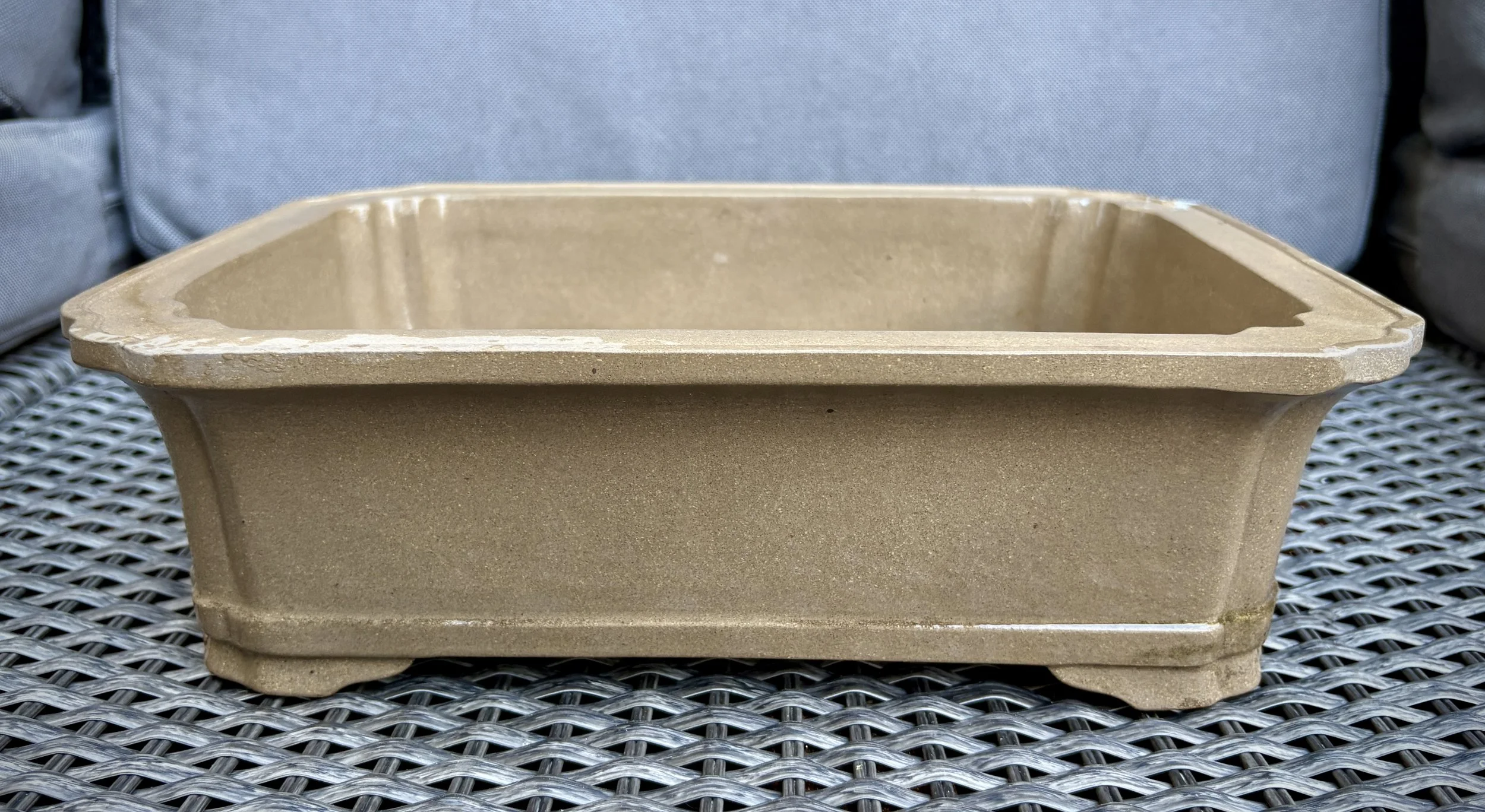 Stamped cream feminine, lipped rectangular pot, unglazed