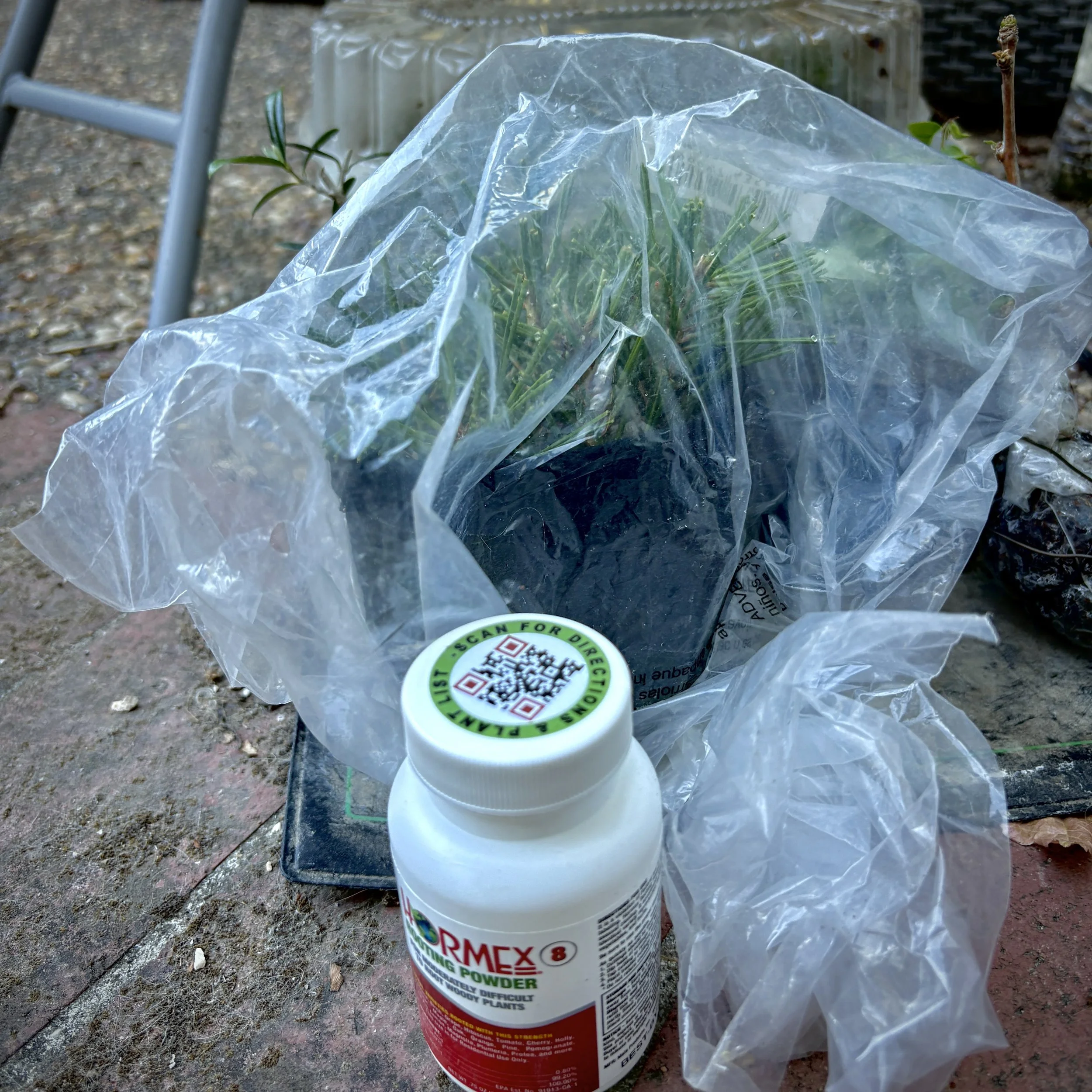 Cuttings, stronger hormones, bagged, on a heat mat.