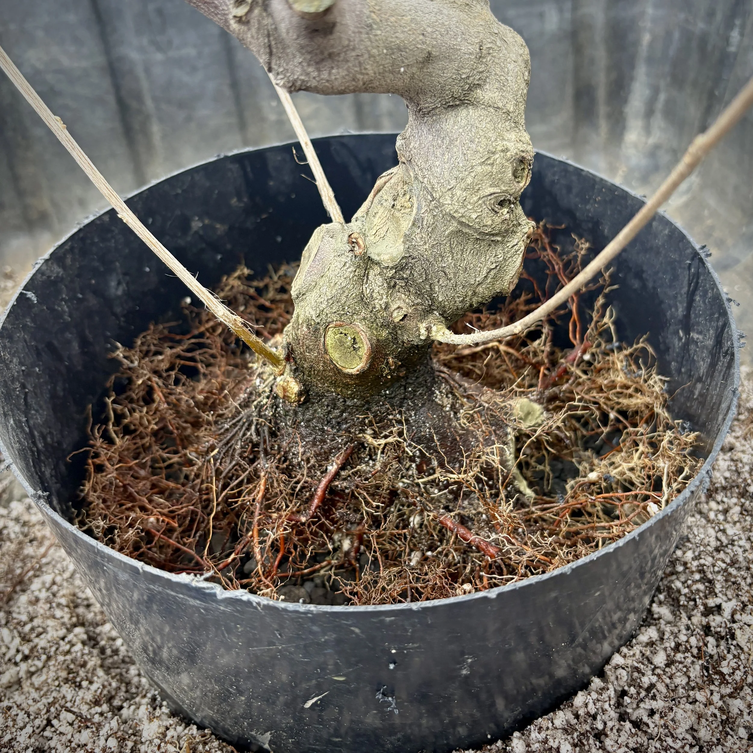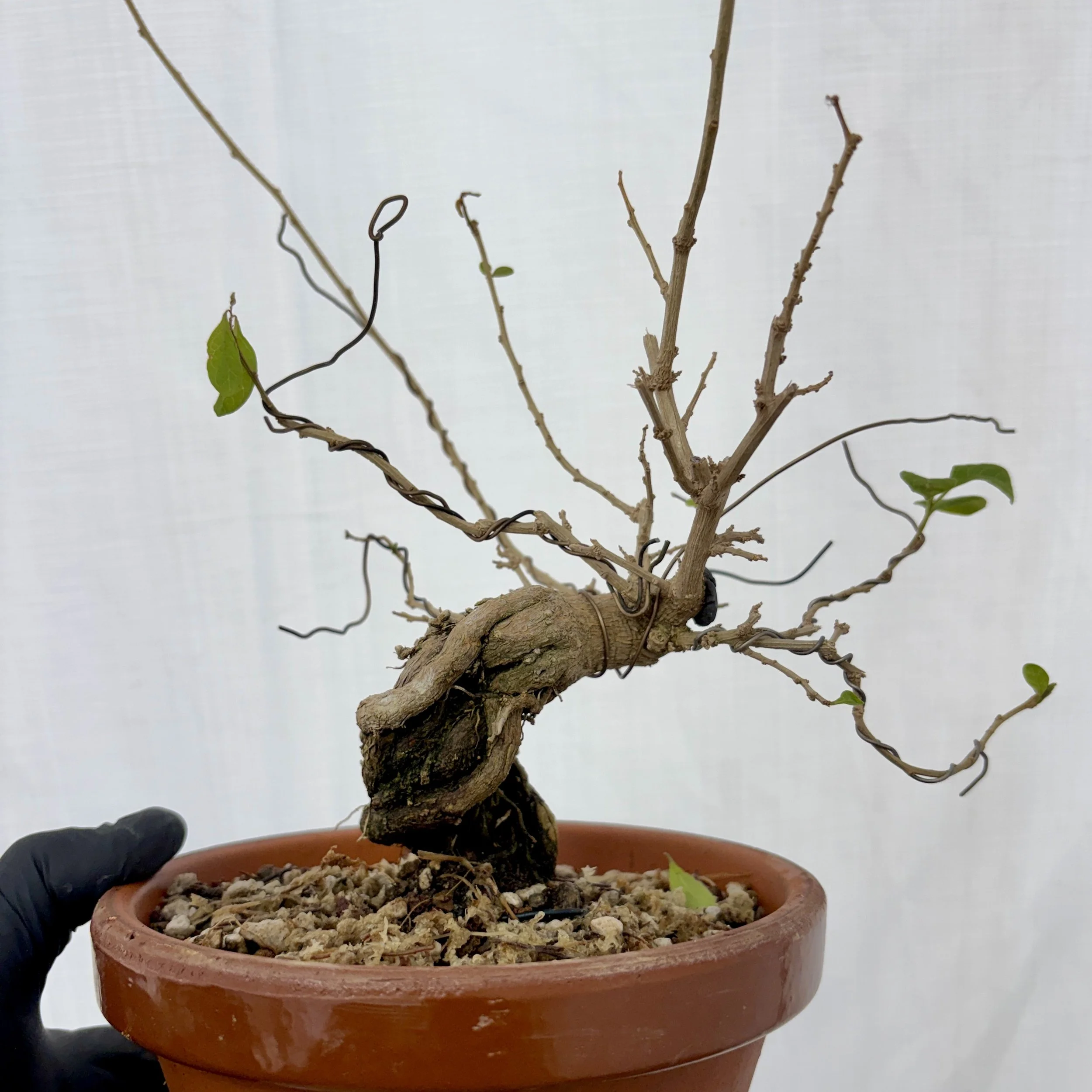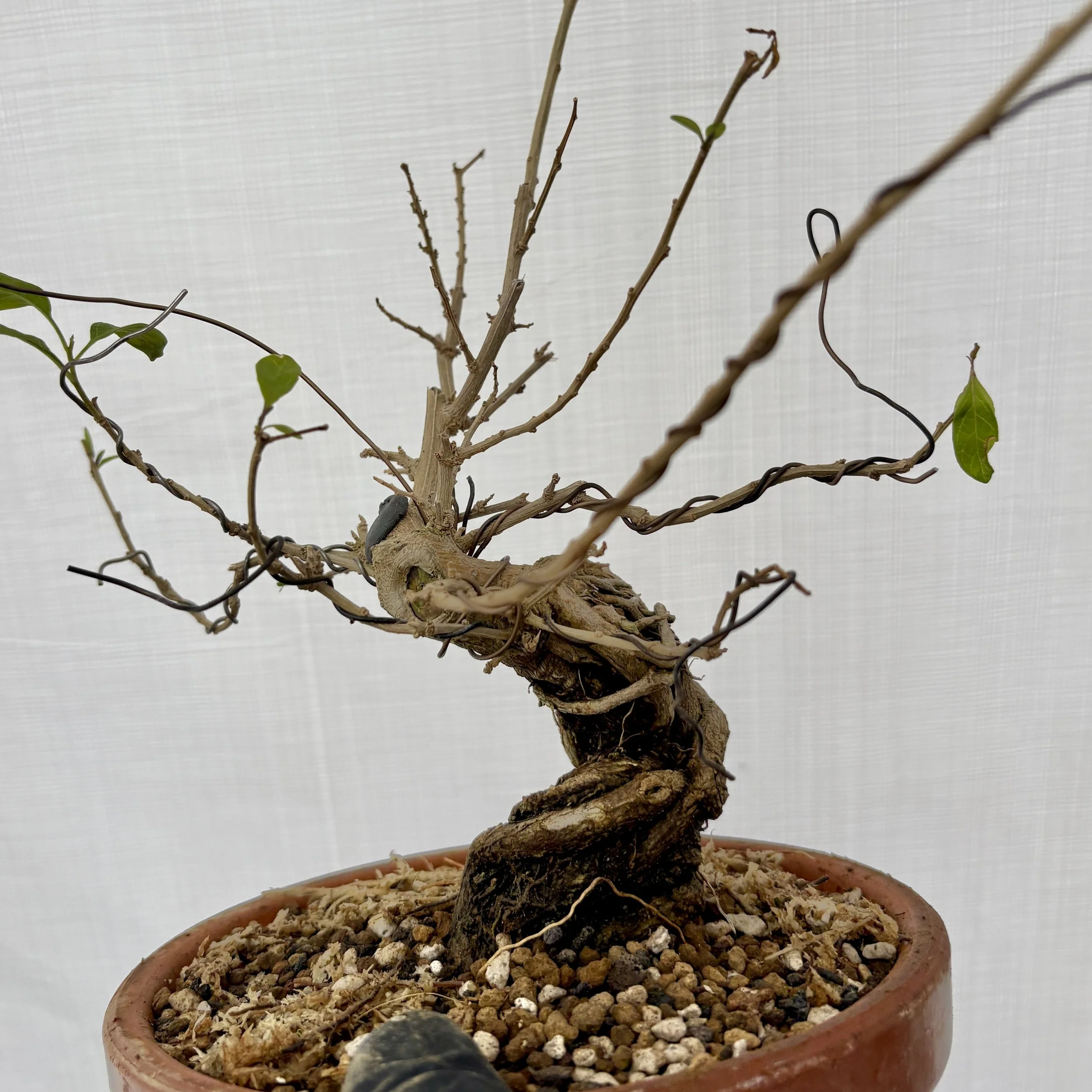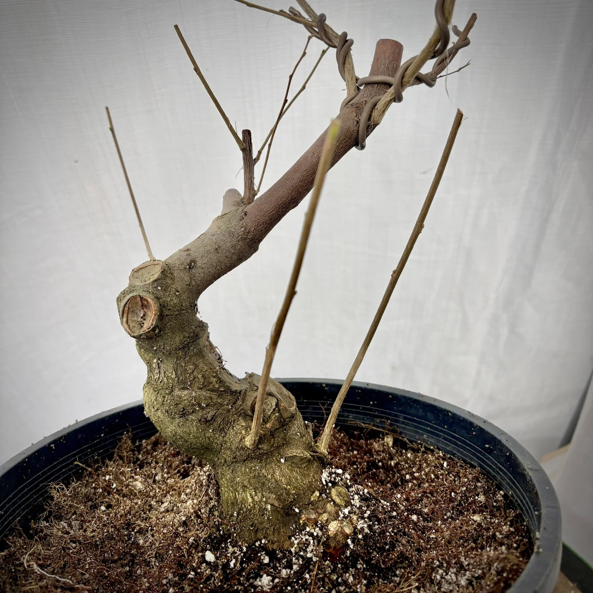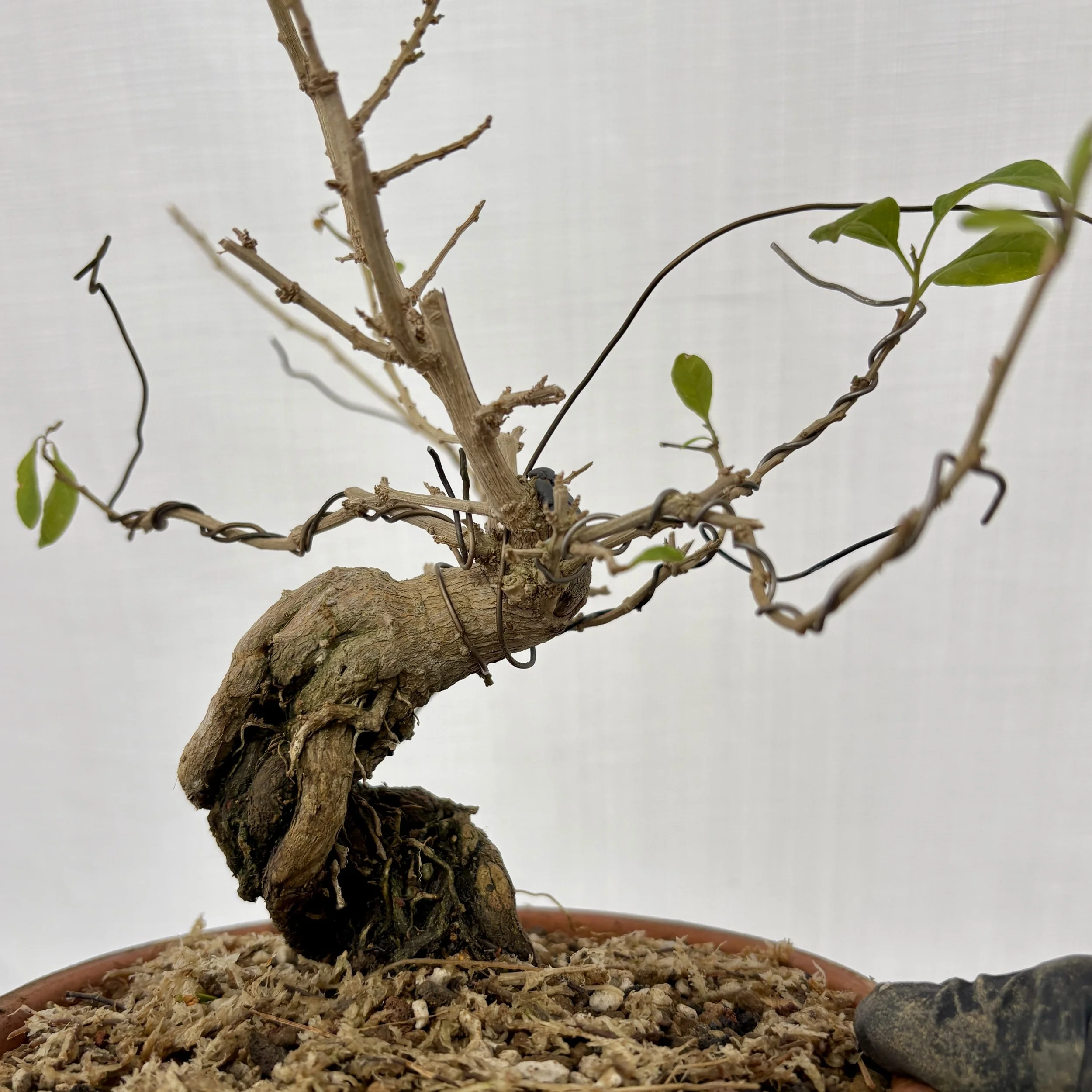 Placed in medium to large size Lava for three or 4 inches then covered the roots gently with the same Lava, then the top inch or so with a standard bonsai mix. No wires needed let it grow, let it grow, let it grow.
