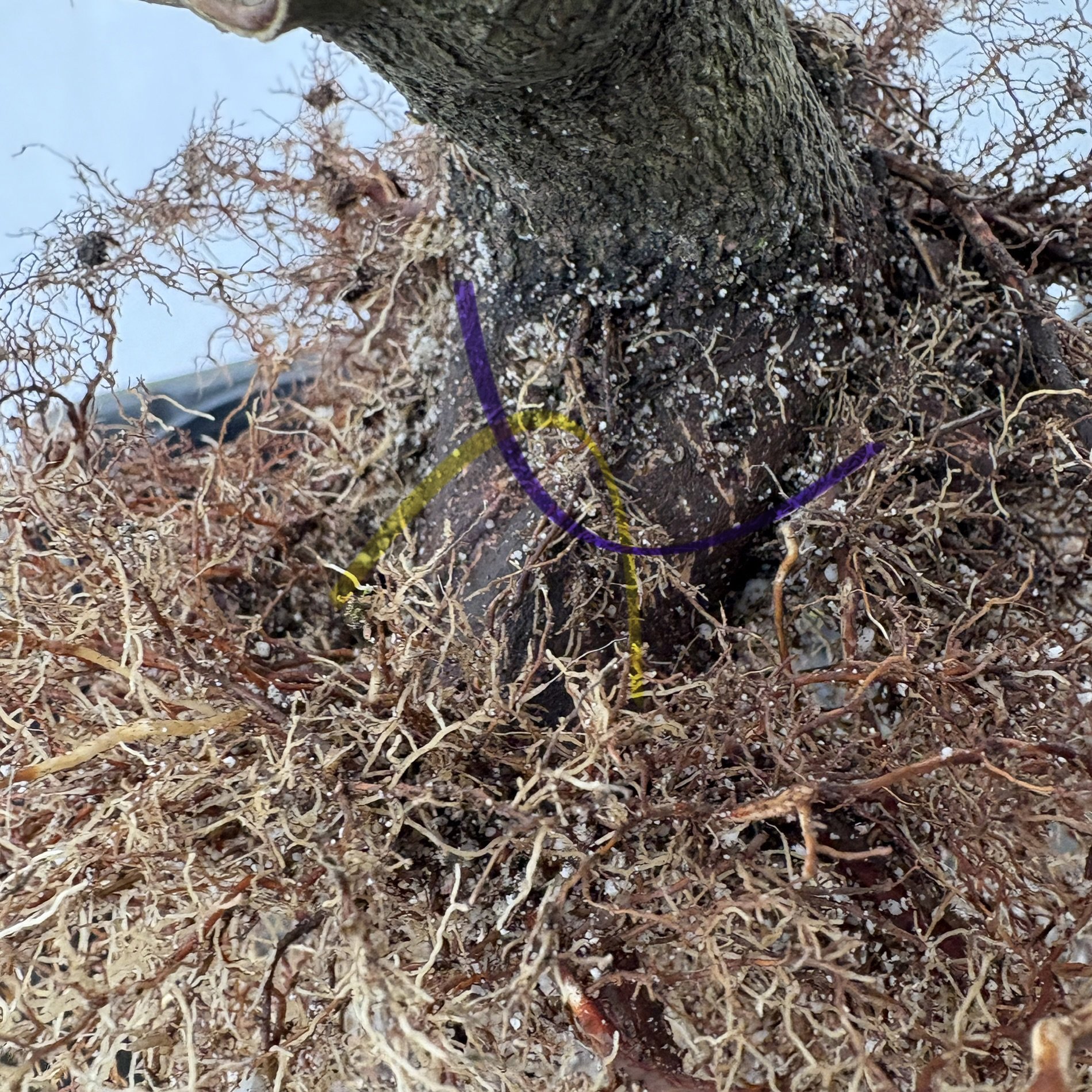 There were two sections of the flare which were unusually wide or uncorrected earlier. Evidence that roots grow well from cuts, so we cut those back and the top roots will develop fully.