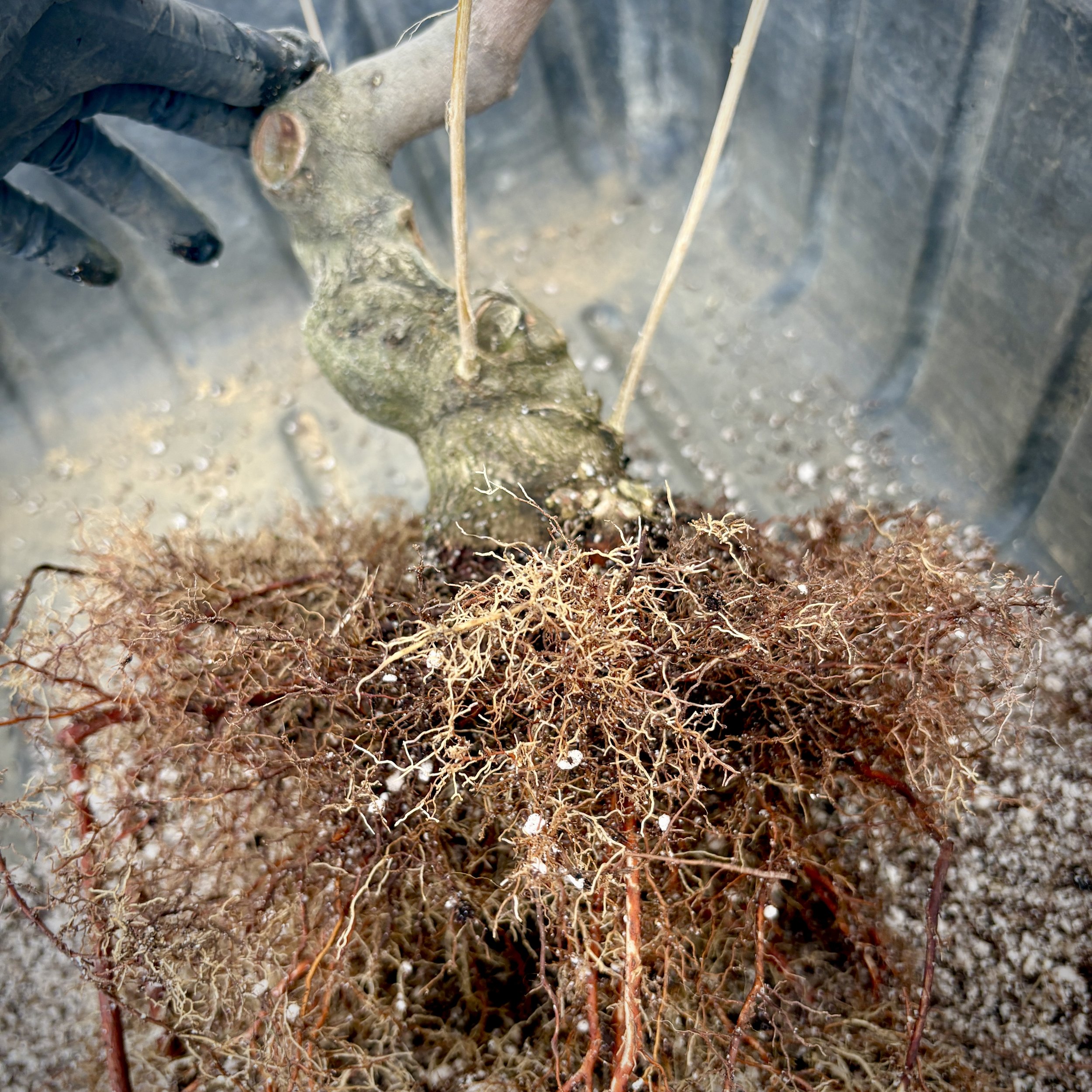 Cover the roots, always cover the roots with soil. Then when there are roots developed circumferentially everywhere he may even cut roots back so that they grow fine roots and have a nice Nabari. But only then would he expose the roots