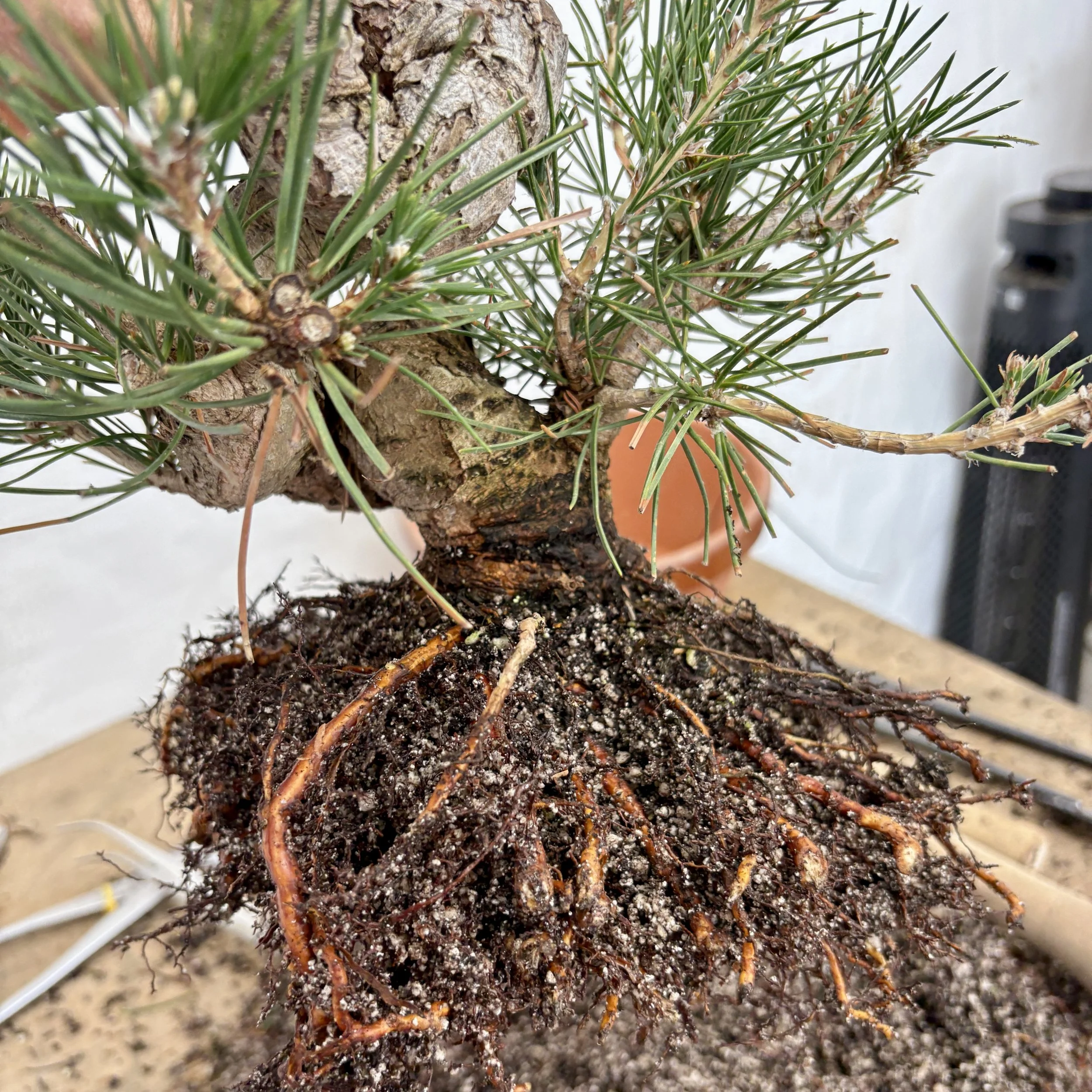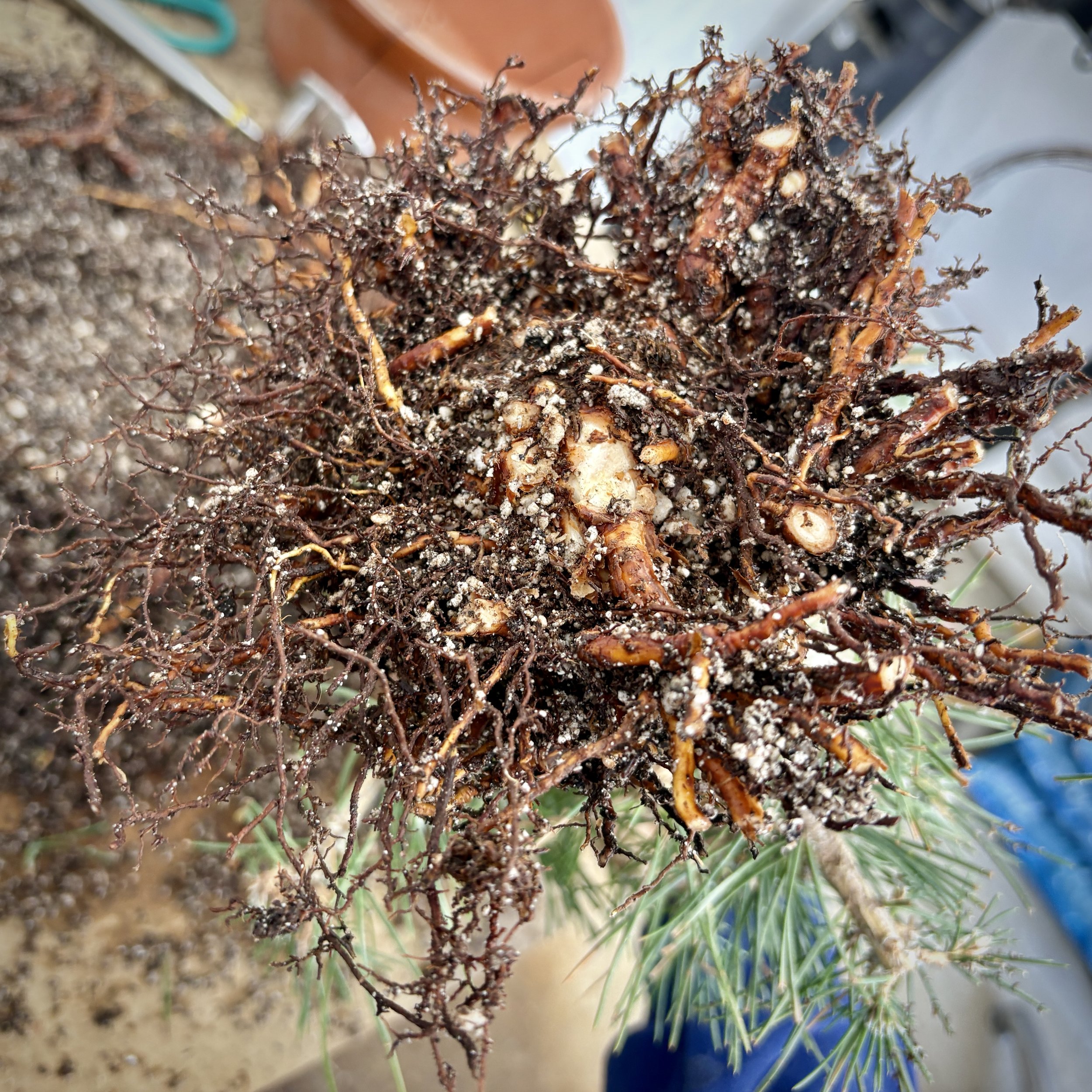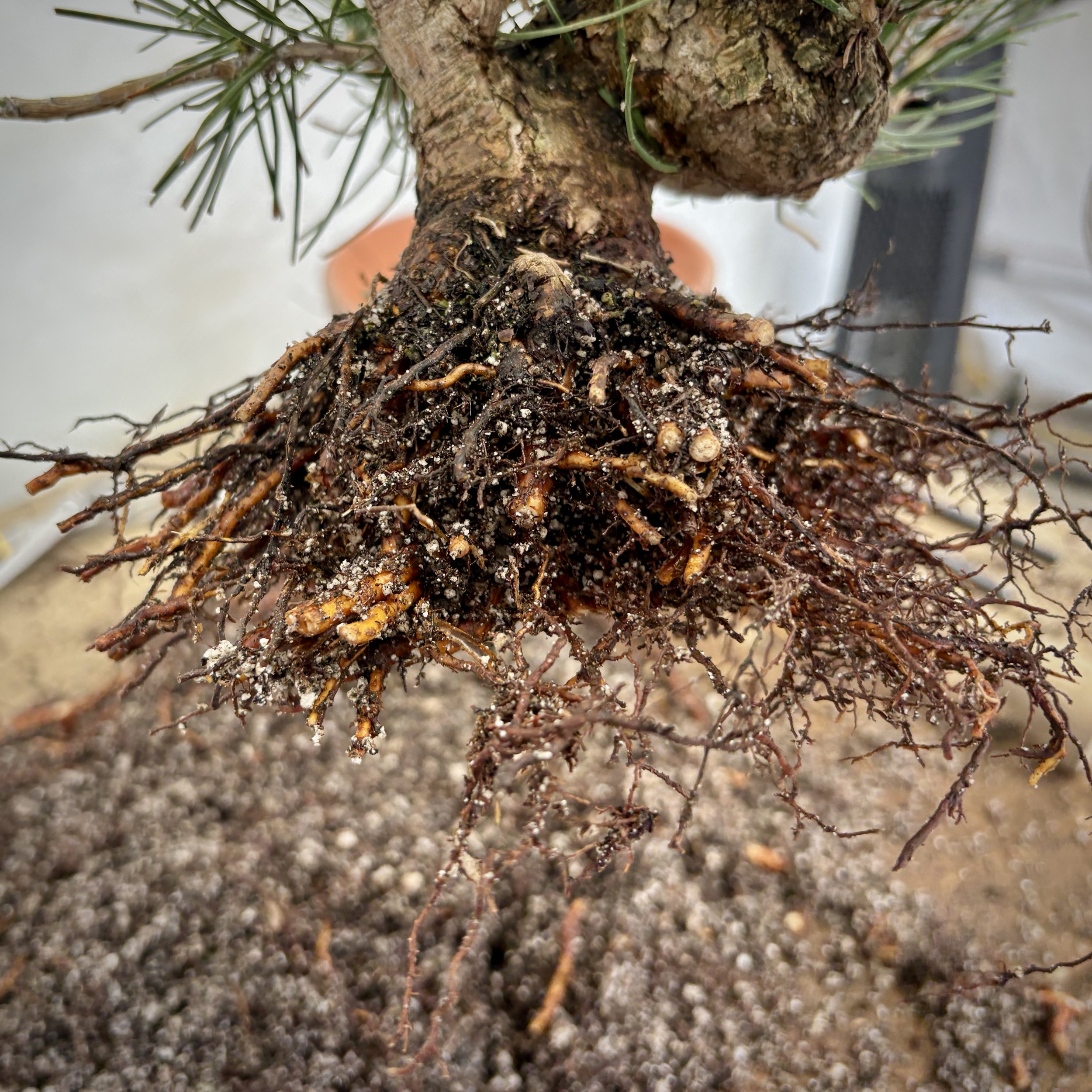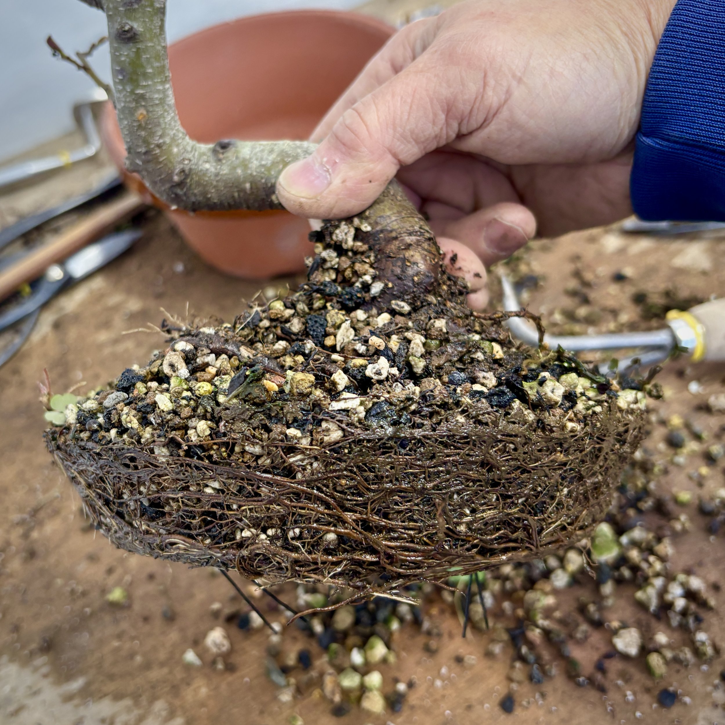 Base was too tall, so cut off 2 inches, losing most fine roots but not all. Next time I should cut the the final height after collection. But large pumice did result in a lot of roots after 2 years.