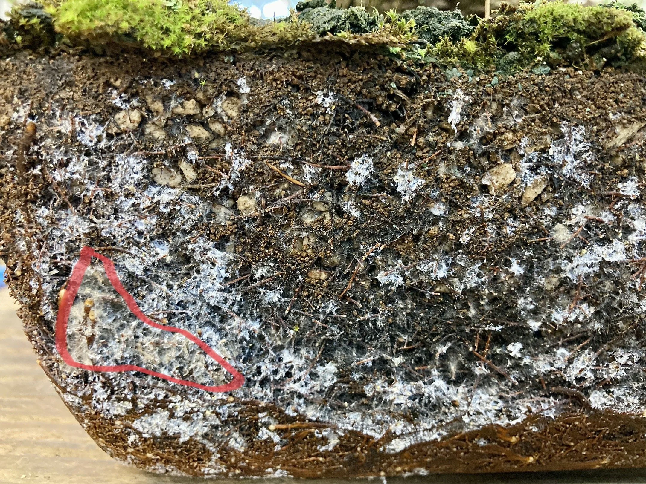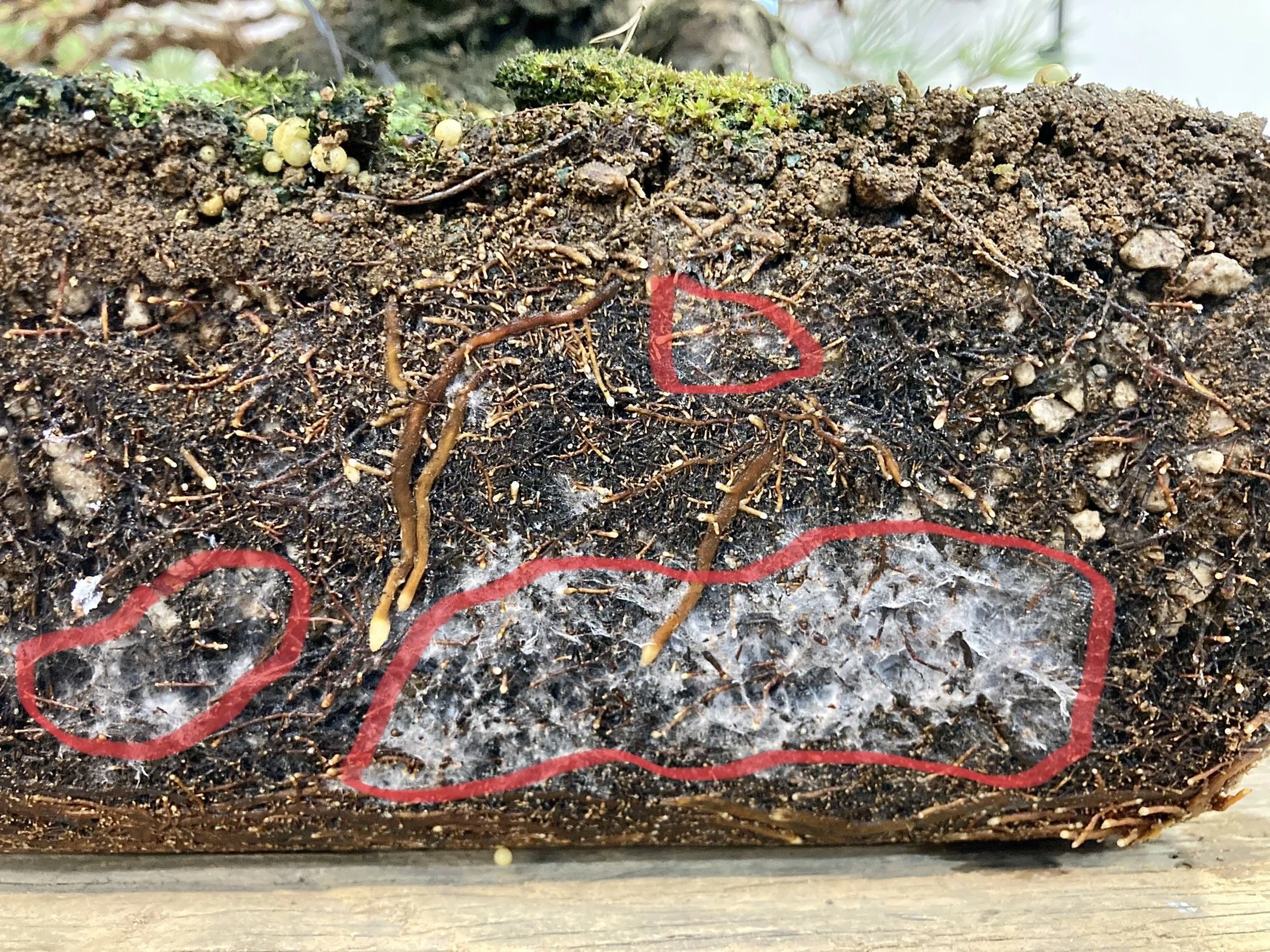 Mycorrhiza; The milky, soft-looking, off-white patches are outlined in red.
