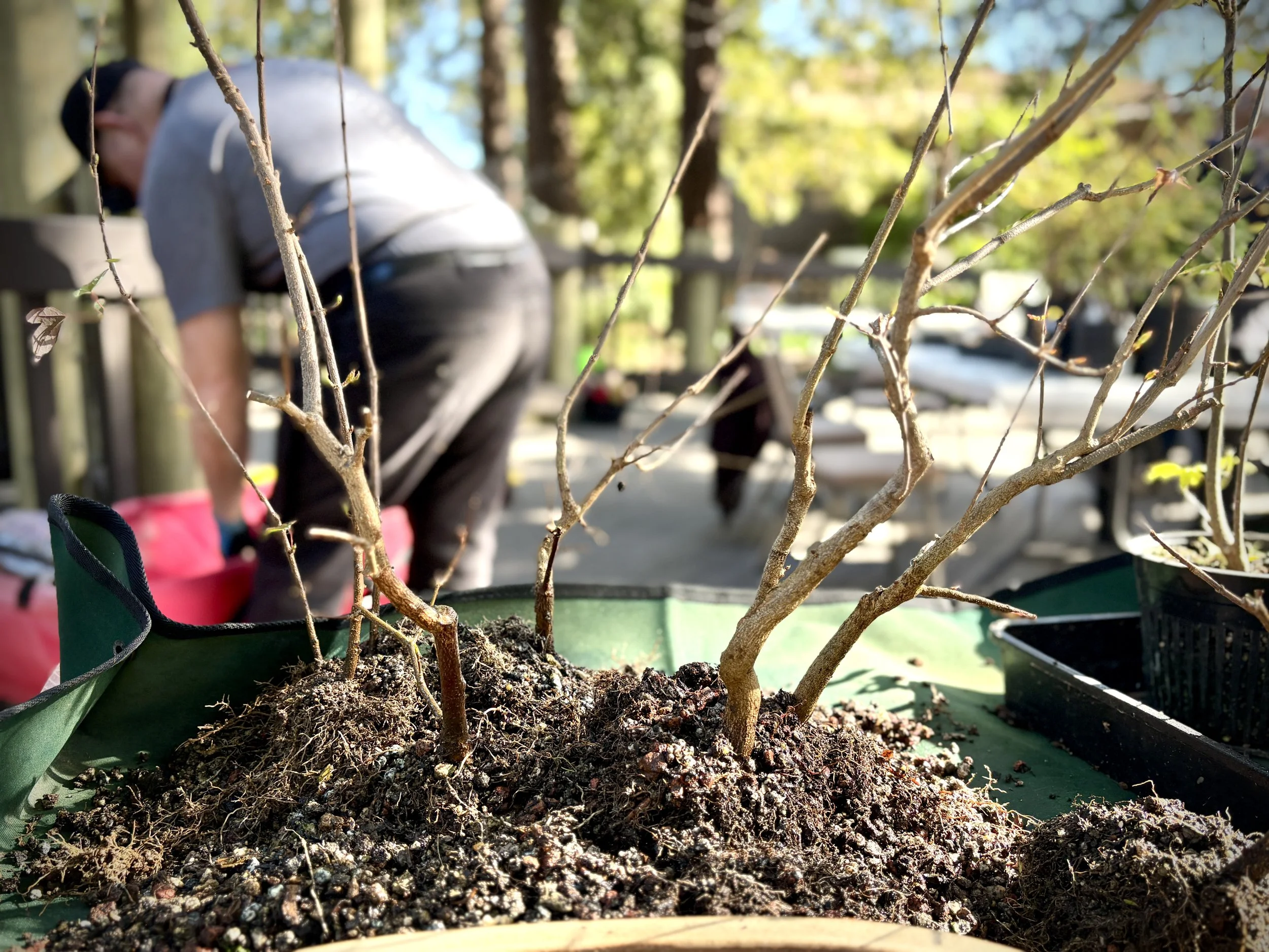 Prepare the trees by raking the soil out and doing root work so that the root ball may be sitting flat and even length of roots