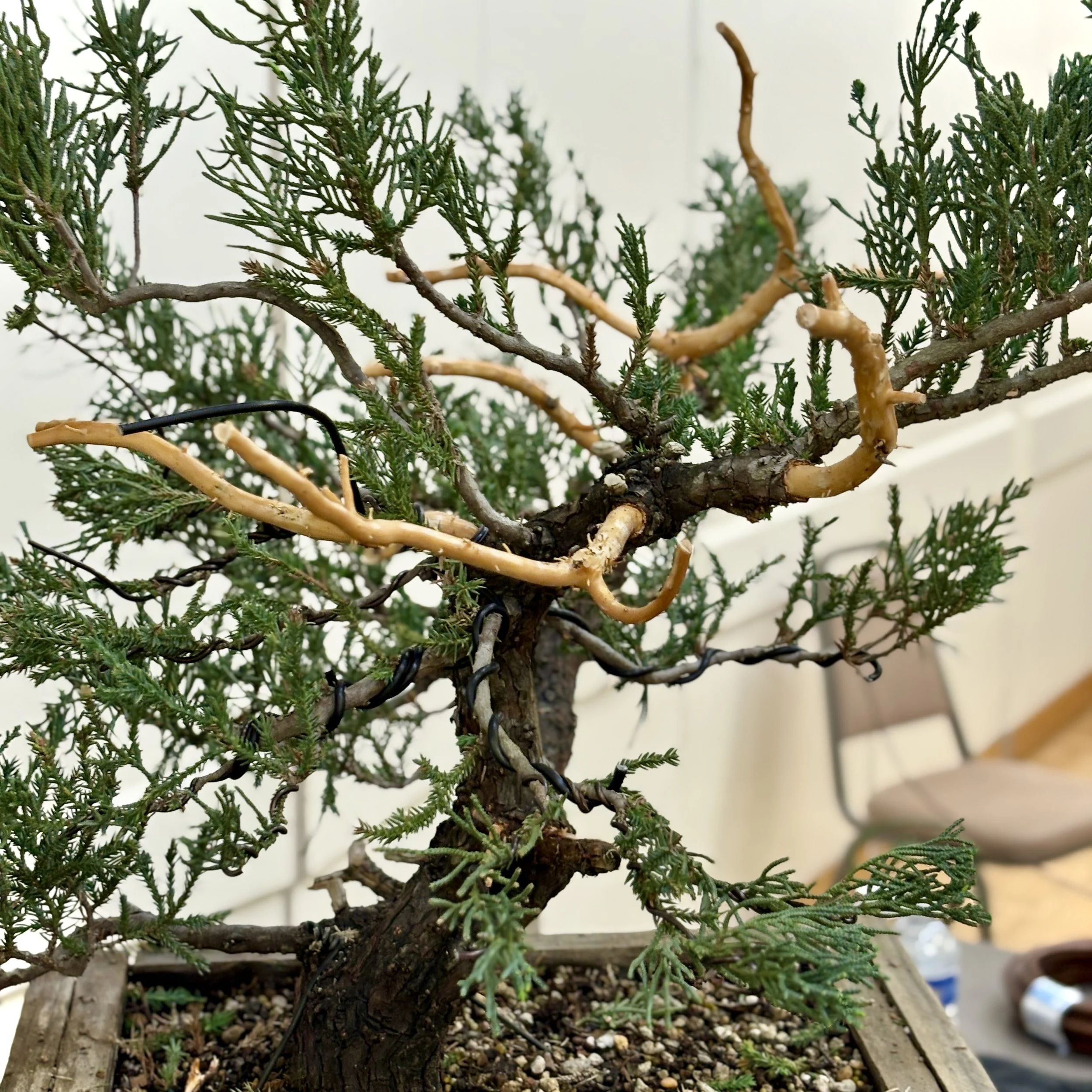 When designing junipers, easier to use or shape smaller more flexible branches than to work with bigger rigid branches. Bends will be too gradual and not dramatic and acute.
