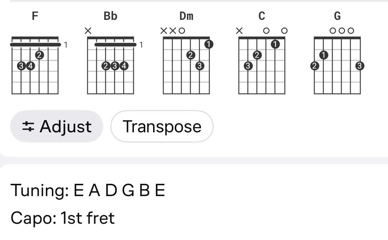 Fmaj7 (XX3210). Gsus4 (3X0013). Dsus2/F# (200320)