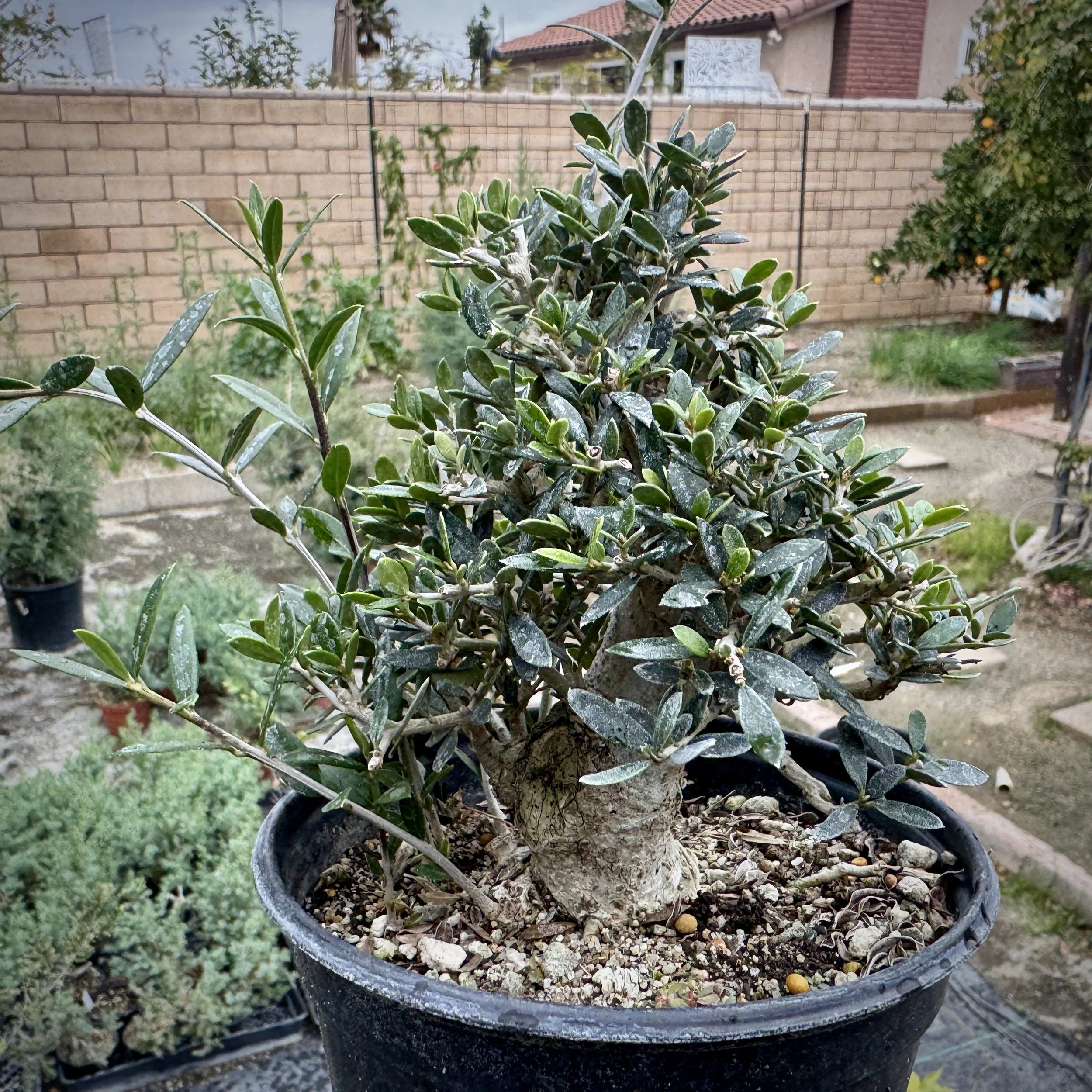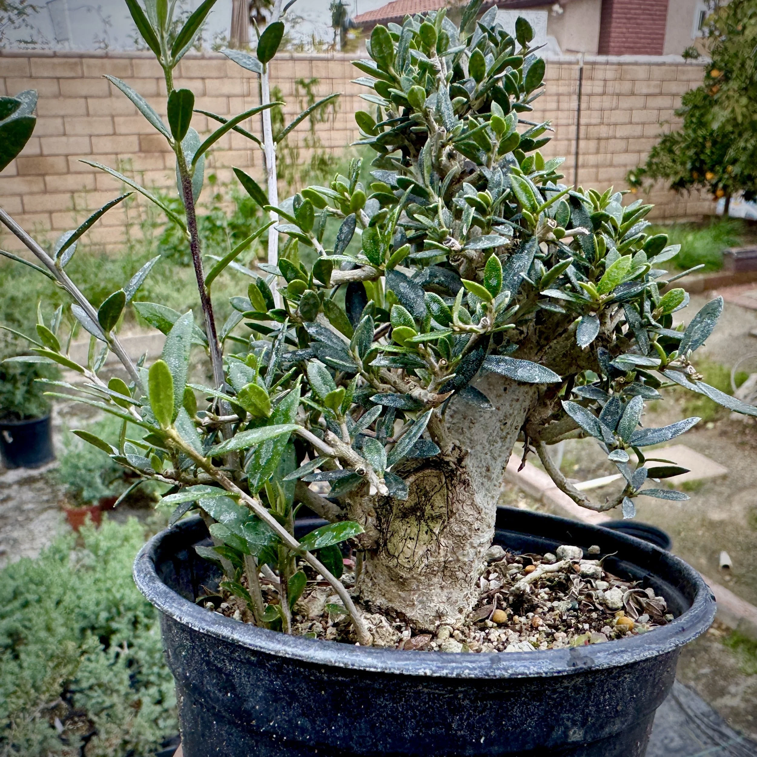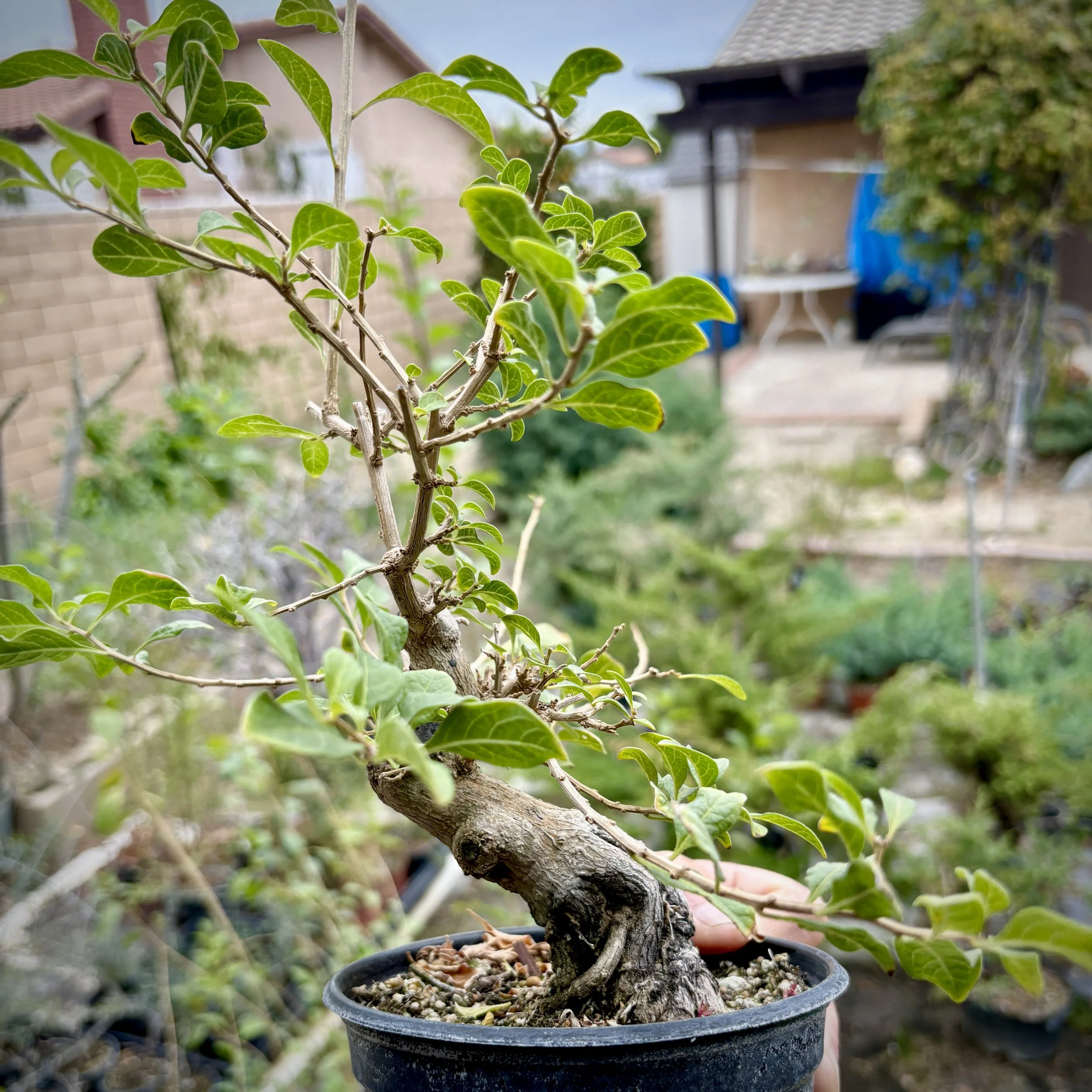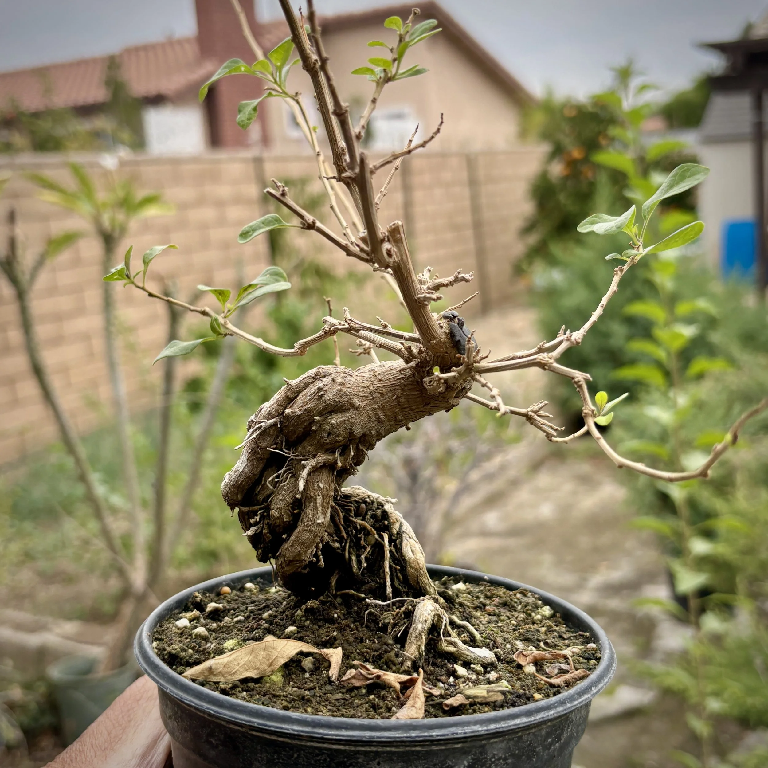 Not a common bonsai material. Originally found in a parking lot and developed and propagated. Once in a bonsai pot & bonsai soil, the leaves can reduce easily. Flowers Apr-Aug, with flowers shaped as potato’s. (Remove finer roots on the upper exposed roots. Focus on the stronger roots.)