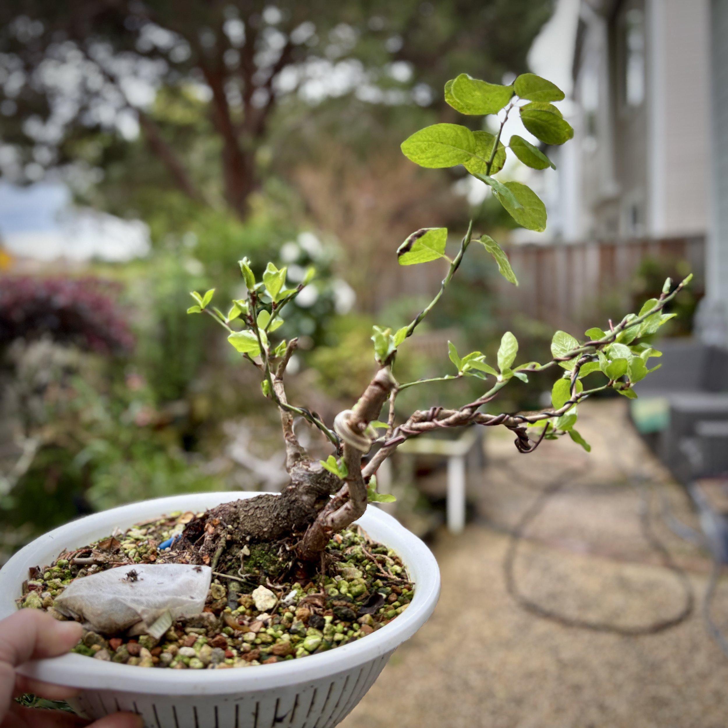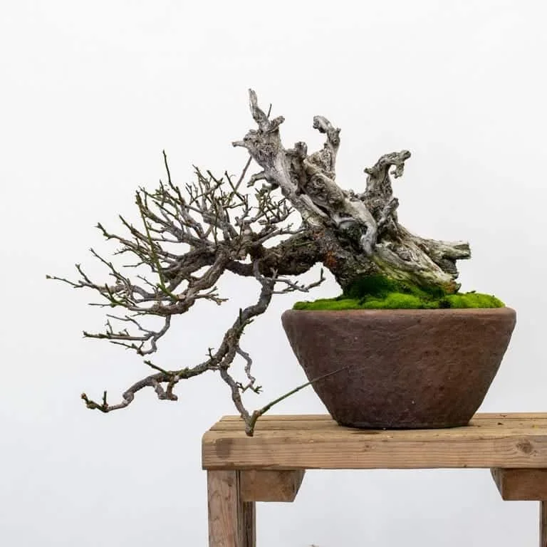 Very large, older barked base. Has been gown in organic 5 gallon po, on top of a felt diskβso about 2β thick matt of roots. Strong branches to select and prune back. Was planted as a raft, and upon inspection (bare rooted) there are many fine roots. I desire to not repot as a raft, though Ume may be styles that way, may choose to angle the trunk and elevate the top. 5/18/25.