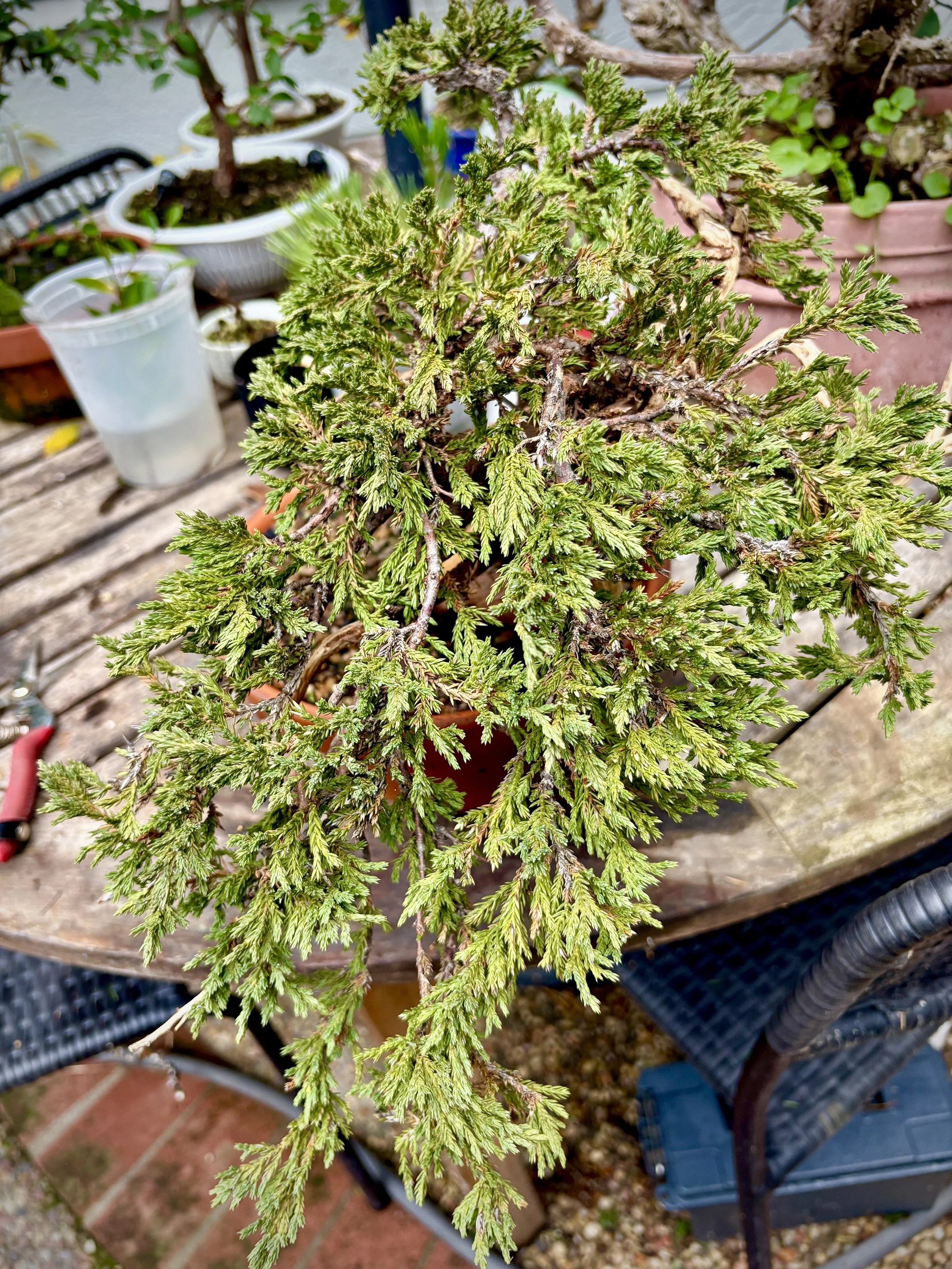 Purchased ground juniper from Gerry Fields’ estate. Great movement with Shari potential. great nebari, very few fine roots. Will recover in a closed bin. While not ideal foliage, it is soft.