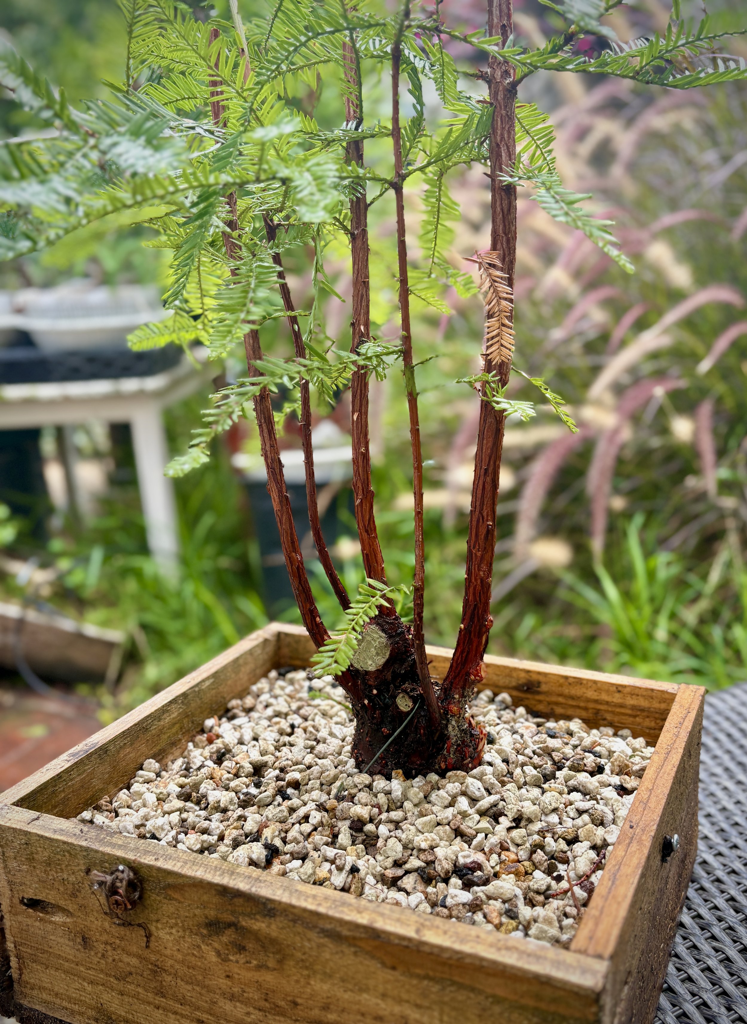 Possibly β Blue Aptosβ variety. Large pumice drainage, large akadama, small akadama and then salvage mix, more large pumice and mix. Not much to hold down, so a pair of wires went across the top, and a string of wires circled close to the trunk and over one large root.