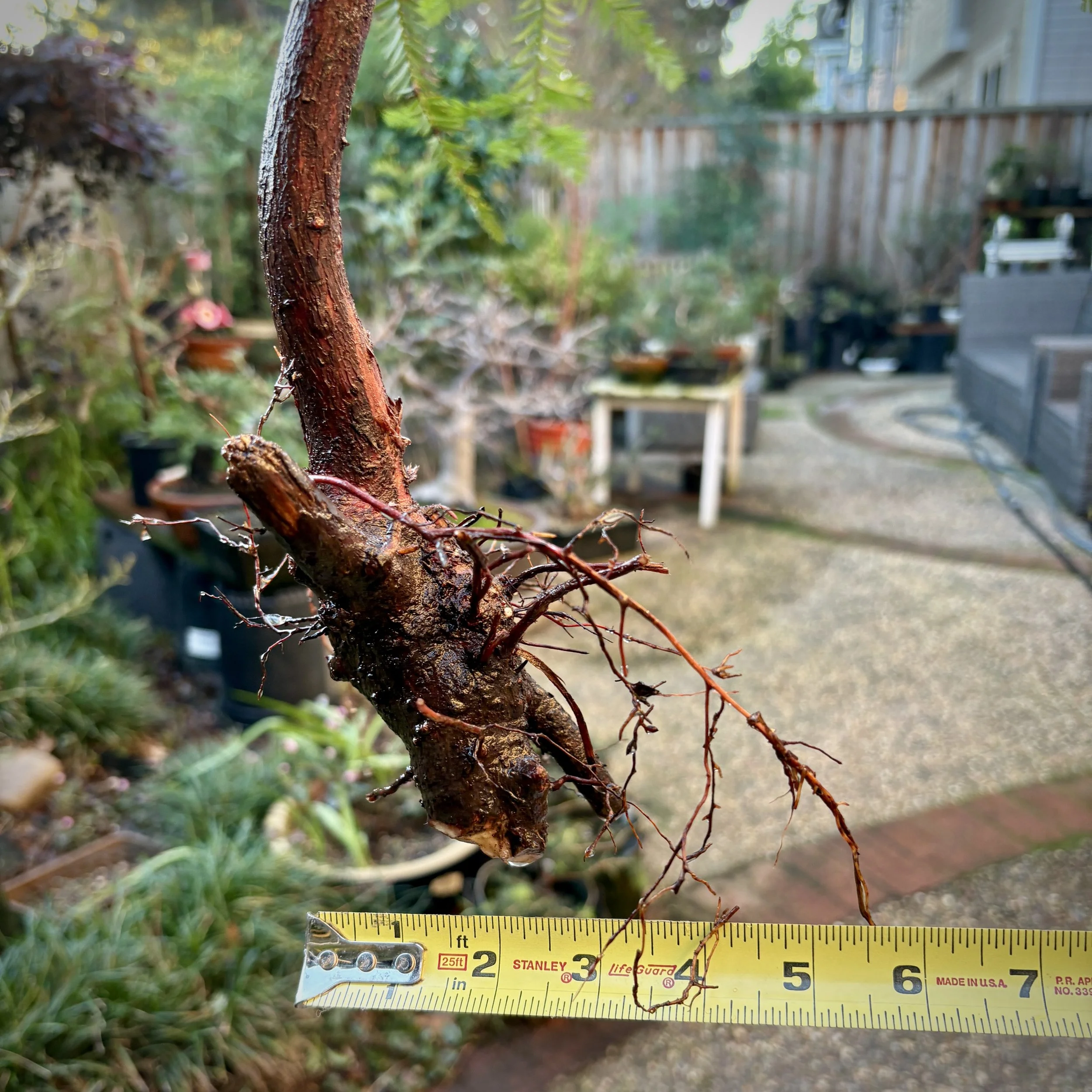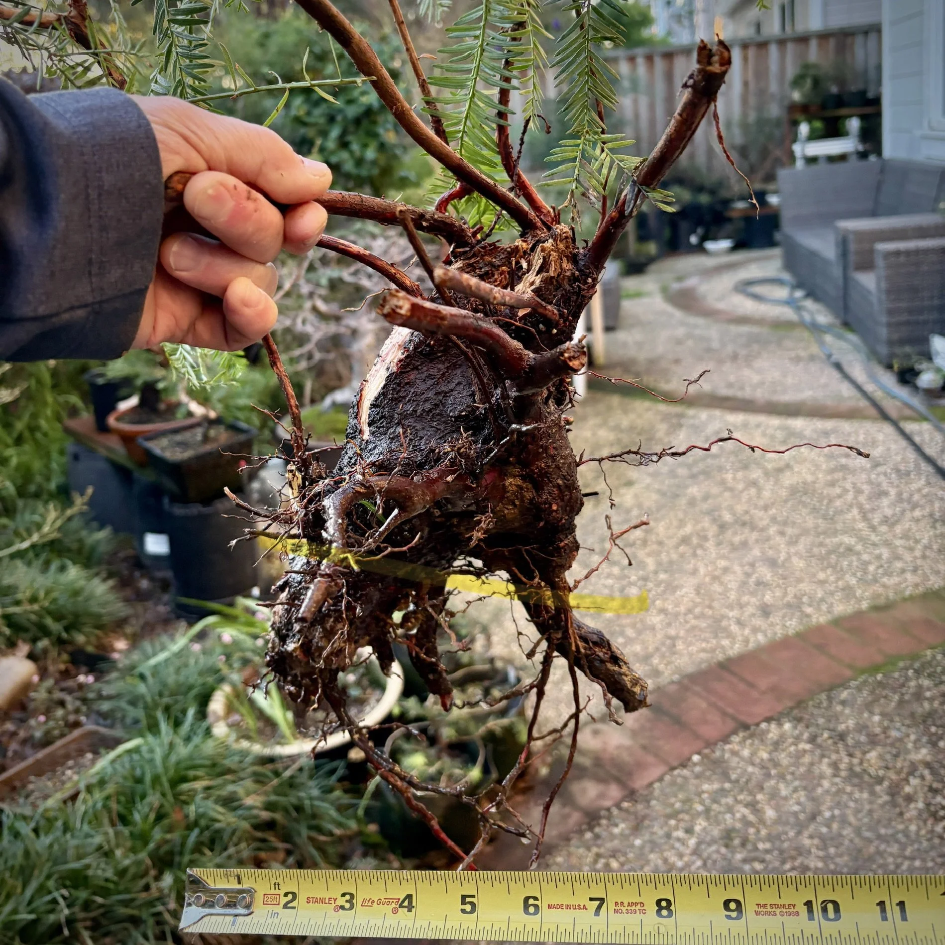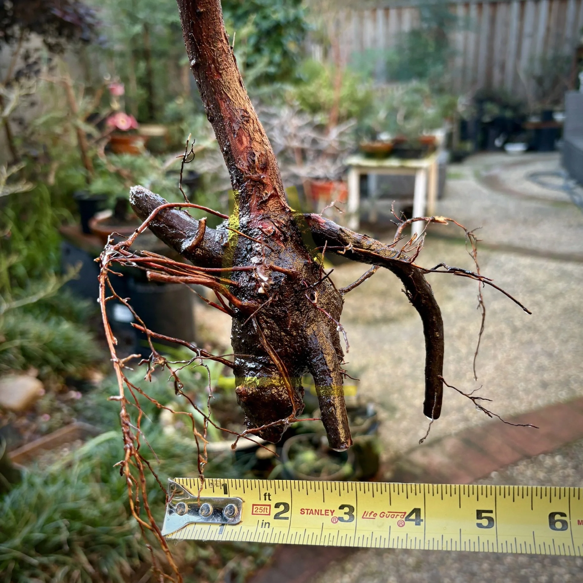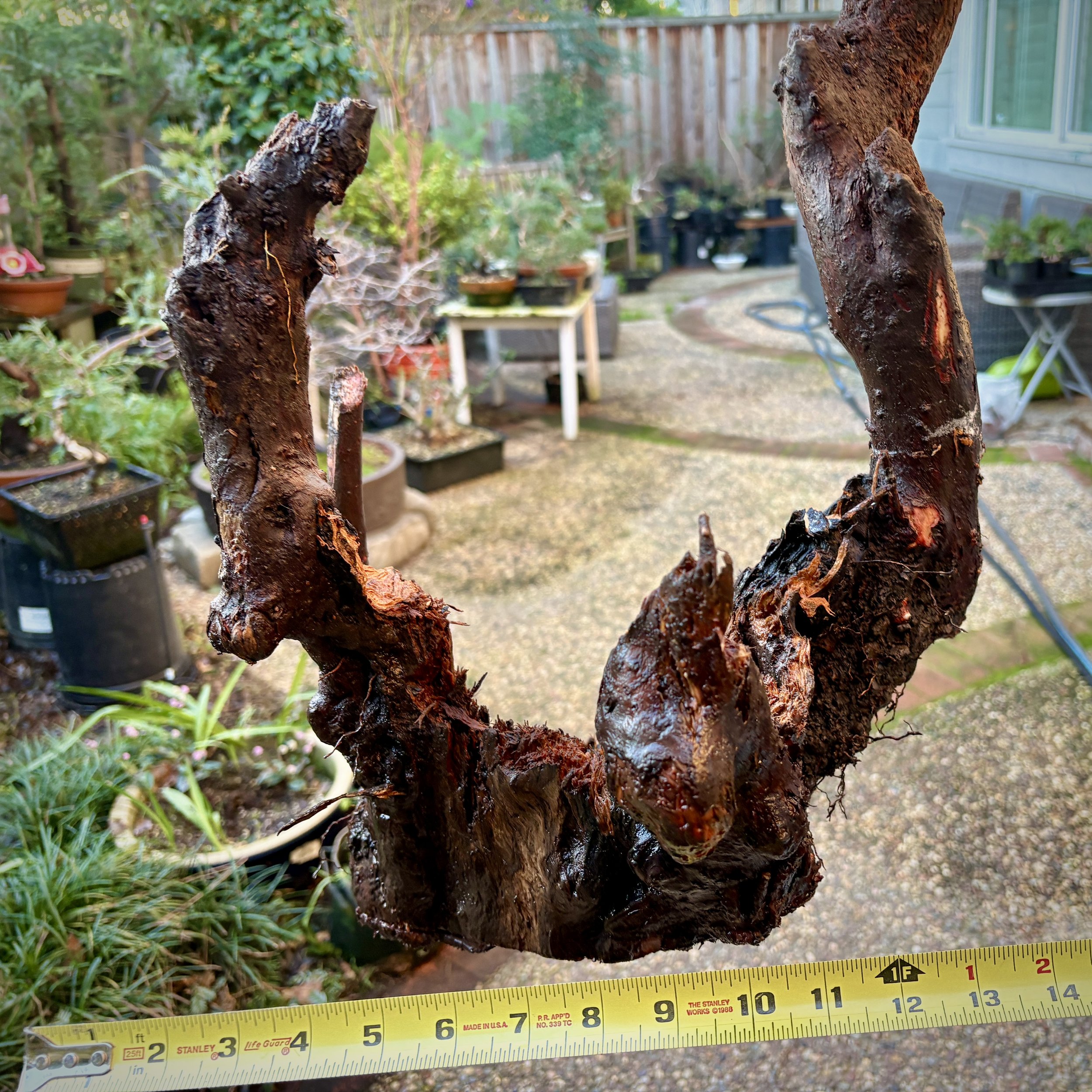 The largest piece may grow roots, but after digging out the exposed small trunk we discovered it to be part of a hollowed trunk below the soil. It will be an abstract form, if it takes.