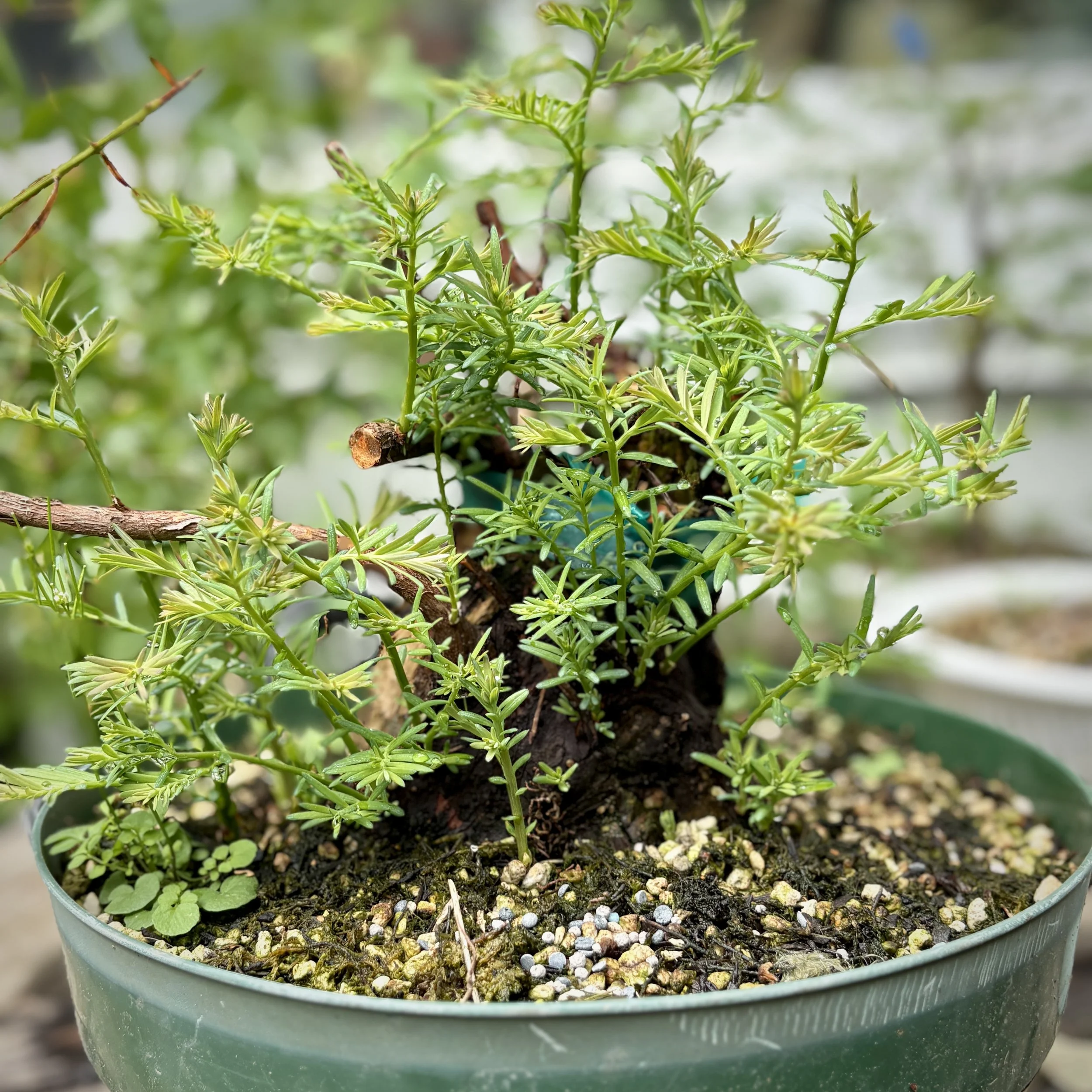 Large Kanuma pumice, a handful of horticultural charcoal, medium pumice on top, dressed with shredded moss.