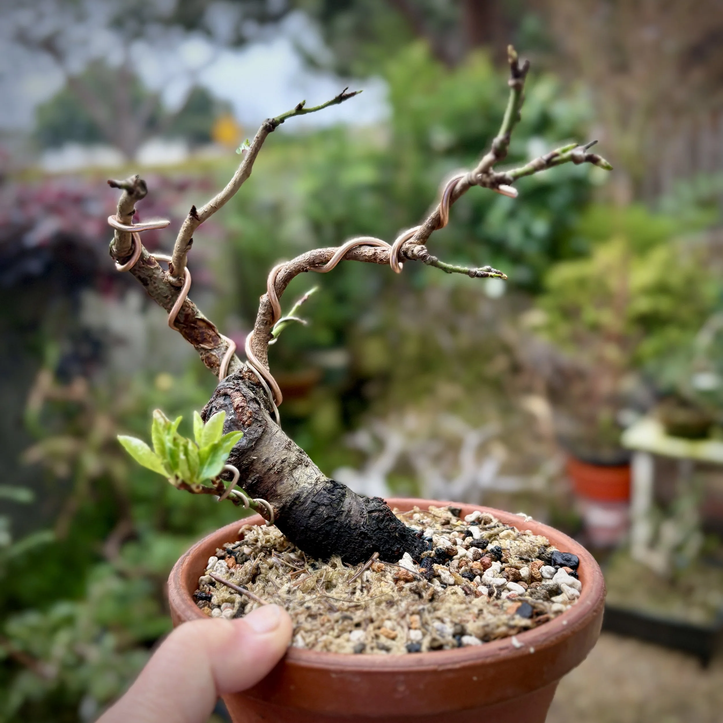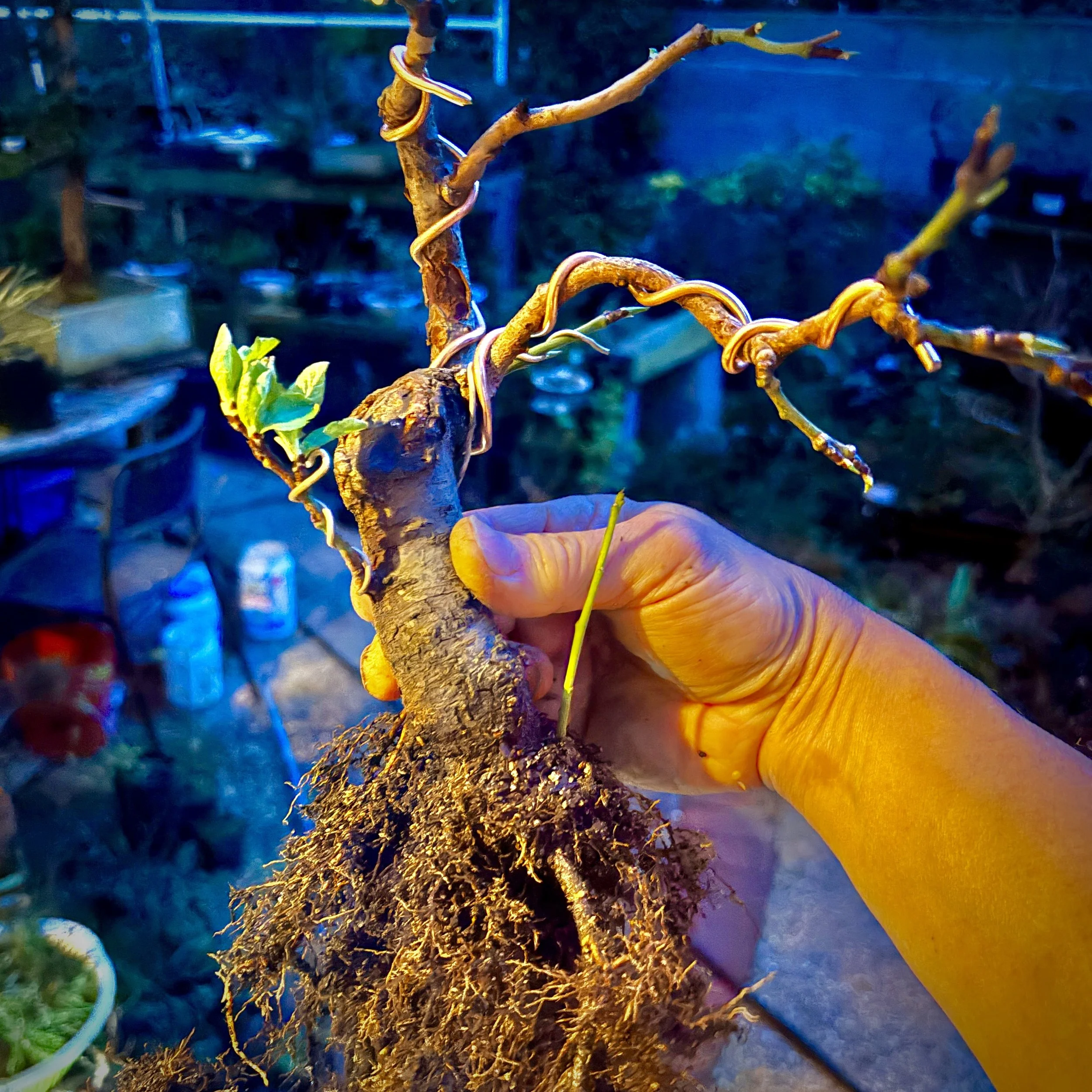 From a collection of rooted Santa Rosa Plum trunks, this was in a nursery pot with compost soil for 1-2 years. The 8” trunk that was buried had top roots and bottom roots. I cut below the top roots, potted in a training pot with larger aggregate, reused mix, and topped with fresh Shohin size soil.